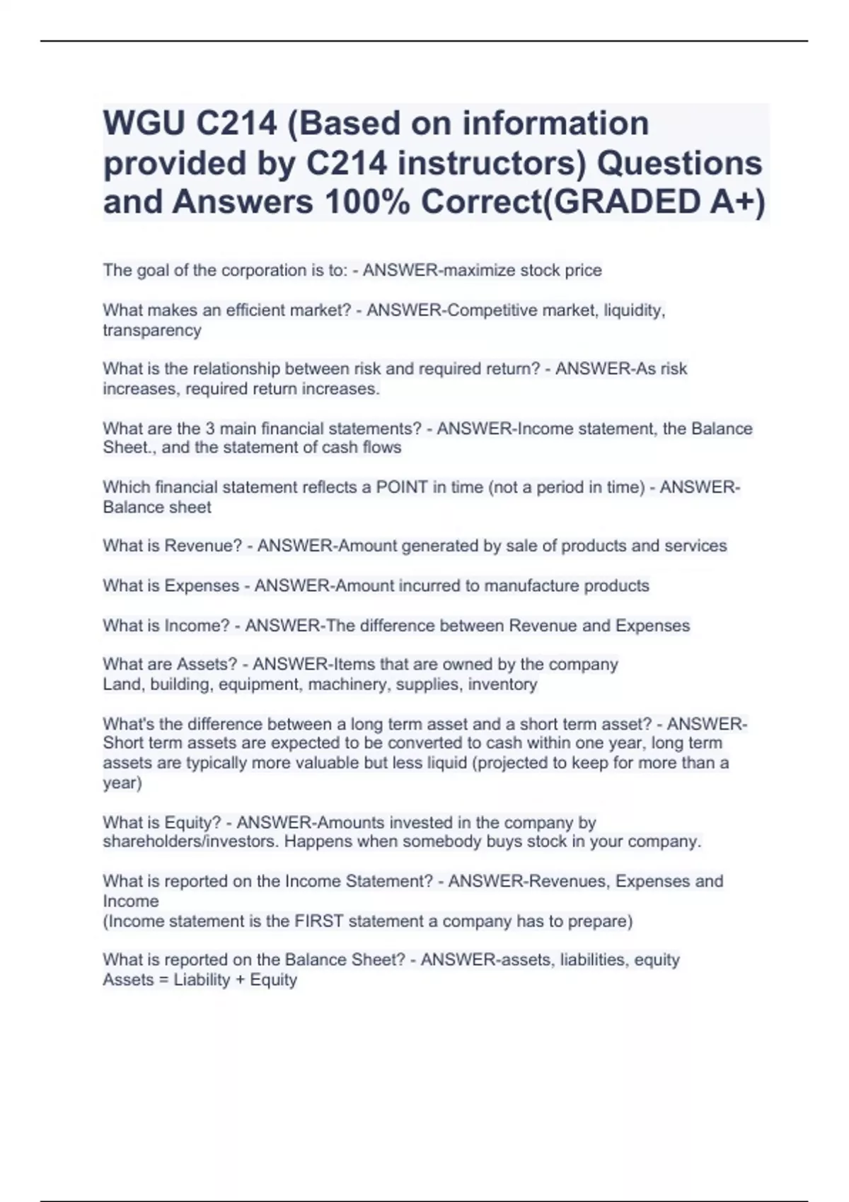 The goal of the corporation is to: - ANSWER-maximize stock price What makes an efficient market? - ANSWER-Competitive market, liquidity, transparency What is the relationship between risk and required return? - ANSWER-As risk increases, required return increases. What are the 3 main financial statements? - ANSWER-Income statement, the Balance Sheet., and the statement of cash flows Which financial statement reflects a POINT in time (not a period in time) - ANSWER-Balance sheet What is Revenue? - ANSWER-Amount generated by sale of products and services What is Ex