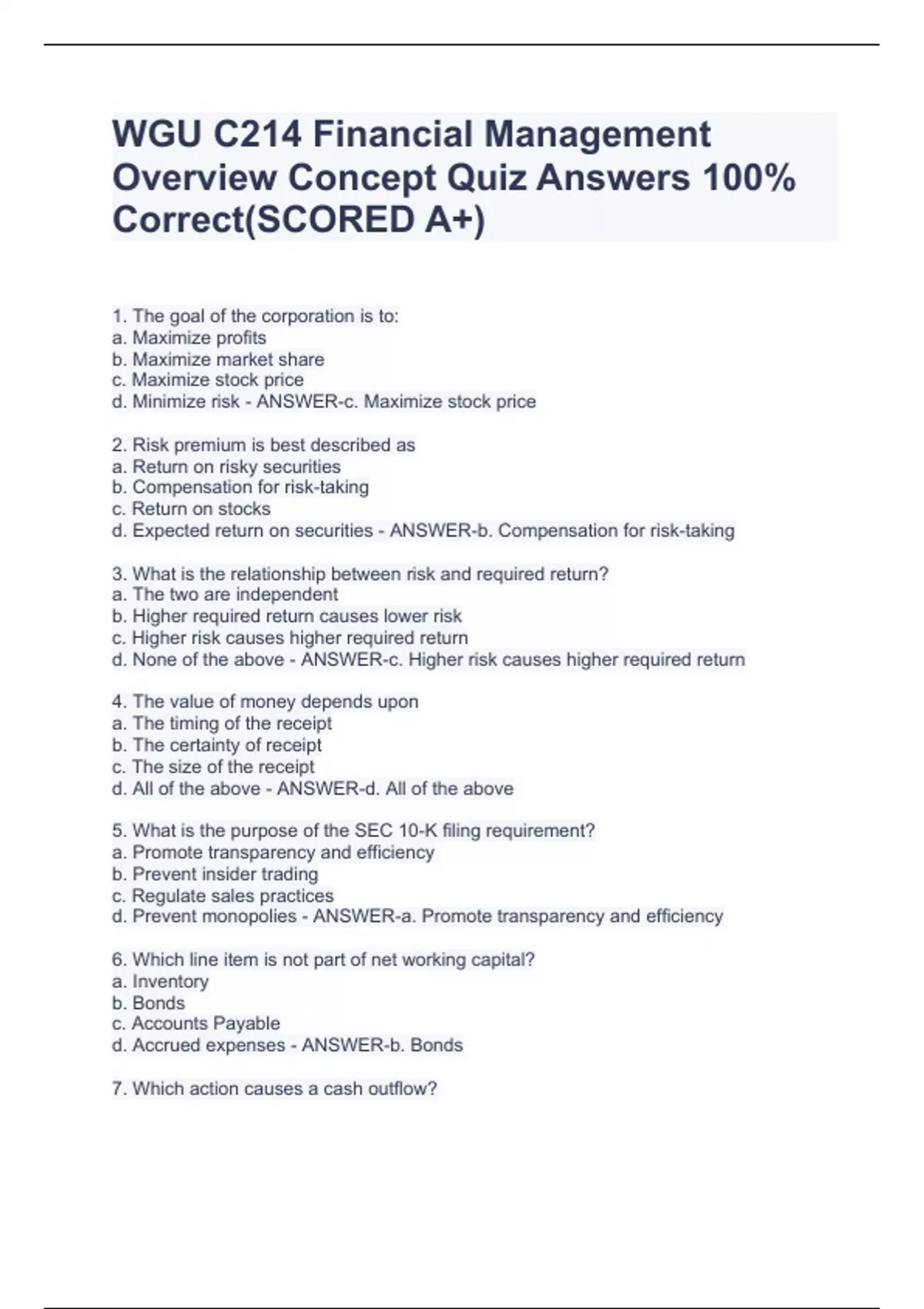 WGU C214 Financial Management Overview Concept Quiz Answers 100% Correct(SCORED A+)