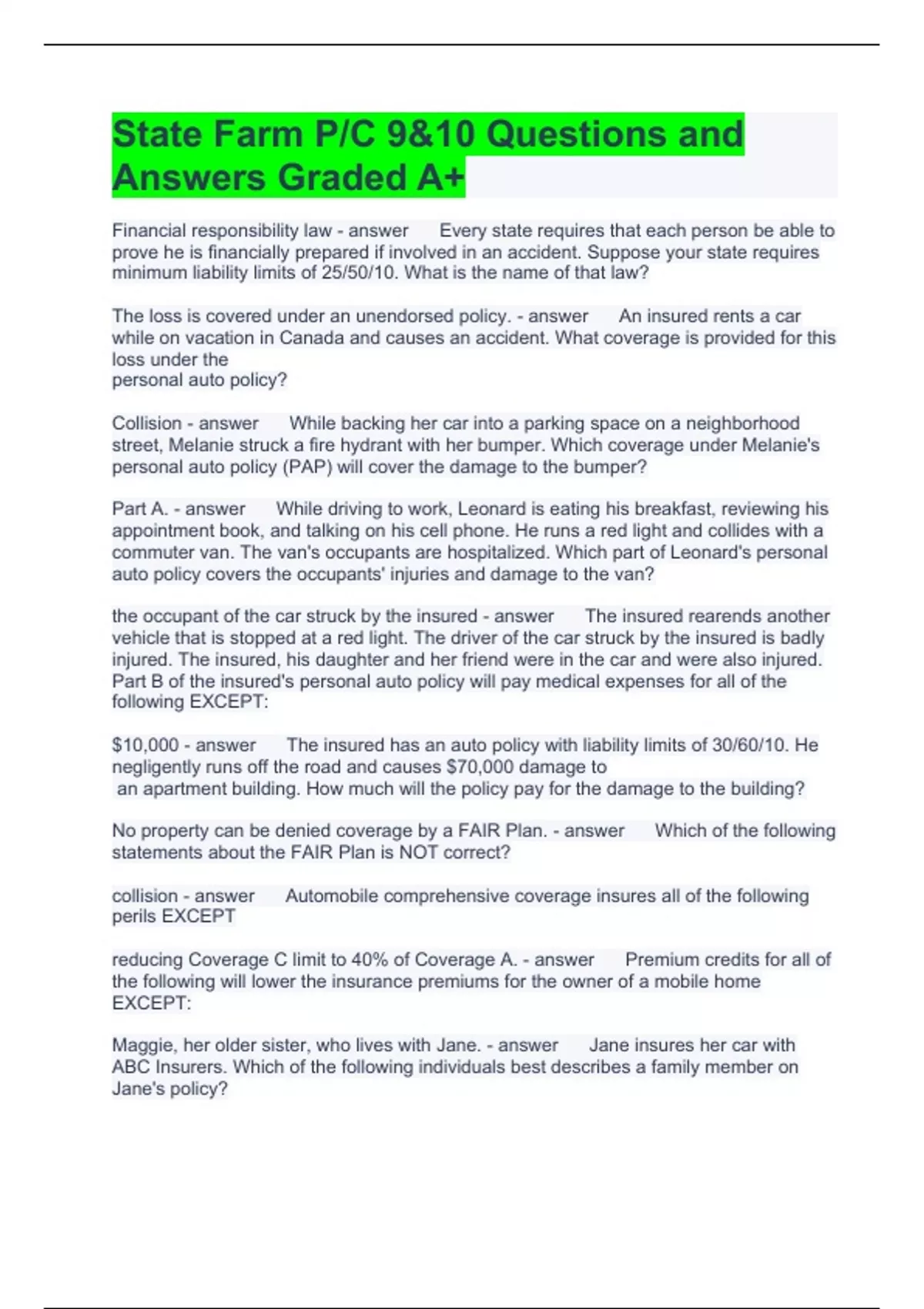 State Farm P/C 9&10 Questions and Answers Graded A+ Financial responsibility law Every state requires that each person be able to prove he is financially prepared if involved in an accident. Suppose your state requires minimum liability limits of 25/50/10. What is the name of that law? The loss is covered under an unendorsed policy. An insured rents a car while on vacation in Canada and causes an accident. What coverage is provided for this loss under the personal auto policy? Collision While backing her car into a parking space on a neighborhood street, Melanie struck a fire hydrant with her bumper. Which coverage under Melanie's personal auto policy (PAP) will cover the damage to the bumper? Part A. While driving to work, Leonard is eating his breakfast, reviewing his appointment book, and talking on his cell phone. He runs a red light and collides with a commuter van. The van's occupants are hospitalized. Which part of Leonard's personal auto policy covers the occupants' injuries and damage to the van? the occupant of the car struck by the insured The insured rearends another vehicle that is stopped at a red light. The driver of the car struck by the insured is badly injured. The insured, his daughter and her friend were in the car and were also injured. Part B of the insured's personal auto policy will pay medical expenses for all of the following EXCEPT: $10,000 The insured has an auto policy with liability limits of 30/60/10. He negligently runs off the road and causes $70,000 damage to an apartment building. How much will the policy pay for the damage to the building? No property can be denied coverage by a FAIR Plan. Which of the following statements about the FAIR Plan is NOT correct? collision Automobile comprehensive coverage insures all of the following perils EXCEPT reducing Coverage C limit to 40% of Coverage A. Premium credits for all of the following will lower the insurance premiums for the owner of a mobile home EXCEPT: Maggie, her older sister, who lives with Jane. Jane insures her car with ABC Insurers. Which of the following individuals best describes a family member on Jane's policy? Actual cash value or cost to repair or replace, whichever is less. Physical damage losses under the personal auto policy are reimbursed on what basis? Other than collision What part of the personal auto policy covers losses caused by malicious mischief, vandalism, hail, or floods? Silo Which of the following property may be insured under a flood policy issued by the NFIP? Vicarious liability. Which one of the following principles is used to describe liability resulting from the negligence of a person who uses an auto with the insured's permission? Funeral expenses for the insured Which one of the following would NOT be paid as supplementary payments under Part A of a personal auto policy? it provides thirdparty coverage. Personal injury protection (PIP) is a form of nofault auto insurance. All of the following characteristics of PIP are correct EXCEPT: Protection and indemnity insurance. Yacht policies provide physical damages and liability coverage. What is the liability section called? The driver's automobile policy under the property damage liability provisions. While driving down the street, an insured swerves to avoid a pedestrian, goes over a curb, and damages a neighbor's fence. Which of the following will pay for the repairs to the fence? Prevents the insured or injured person from collecting medical payments from more than one policy or coverage, such as uninsured motorist. What is a nostacking rule? 30 days after the date of application and payment of premium. When does flood insurance take effect? Arbitration. If a dispute arises over whether an insured is entitled to uninsured motorists coverage, what process is used to settle the dispute? UMPD If a vehicle is insured for collision, this coverage waives the deductible. What is this coverage? It is automatically covered Cecil sells his car and buys another one to replace it. How does the liability coverage in his personal auto policy apply to the replacement vehicle? Medical payments coverage Jane's sister, Maggie, who lives with Jane and just sold her car, drives Jane's sports car to a party. On the way home Maggie loses control of the car, hits a parked car, and rolls the car. Maggie dies as a result of her injuries. What coverage will reimburse Jane for Maggie's funeral expenses? Emergency program and the regular program. What are the two flood insurance programs that are available? motorcycles. All of the following vehicles can be insured under an unendorsed personal auto policy EXCEPT: Phillipsburg, St. Martin. The personal auto policy coverage applies to losses, accidents, or occurrences that take place during the policy period in all the following locations EXCEPT: