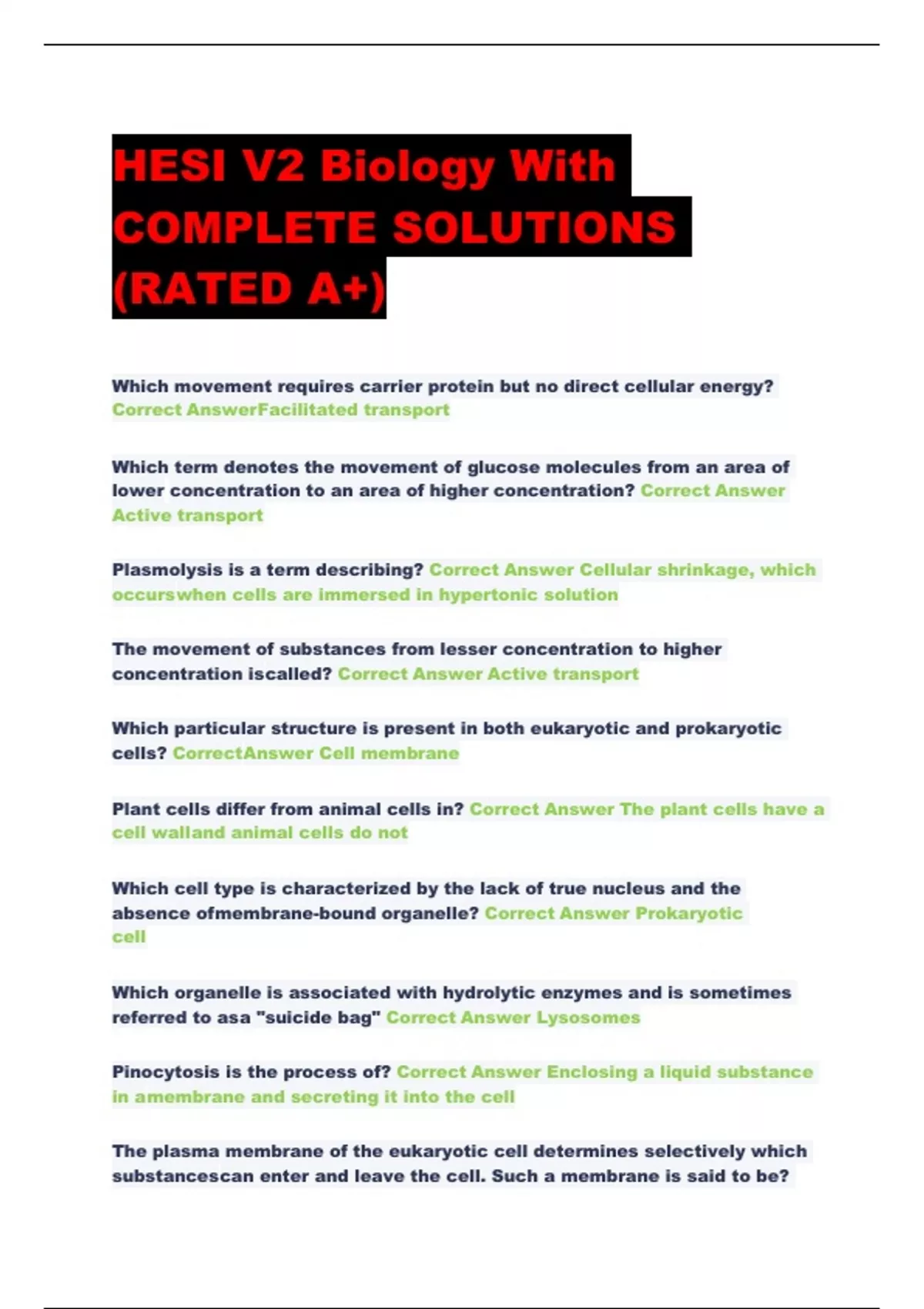 HESI V2 Biology With COMPLETE SOLUTIONS (RATED A+) Which movement requires carrier protein but no direct cellular energy? Correct AnswerFacilitated transport Which term denotes the movement of glucose molecules from an area of lower concentration to an area of higher concentration? Correct Answer Active transport Plasmolysis is a term describing? Correct Answer Cellular shrinkage, which occurswhen cells are immersed in hypertonic solution The movement of substances from lesser concentration to higher concentration iscalled? Correct Answer Active transport Which particular structure is present in both eukaryotic and prokaryotic cells? CorrectAnswer Cell membrane Plant cells differ from animal cells in? Correct Answer The plant cells have a cell walland animal cells do not Which cell type is characterized by the lack of true nucleus and the absence ofmembrane-bound organelle? Correct Answer Prokaryotic cell Which organelle is associated with hydrolytic enzymes and is sometimes referred to asa "suicide bag" Correct Answer Lysosomes Pinocytosis is the process of? Correct Answer Enclosing a liquid substance in amembrane and secreting it into the cell The plasma membrane of the eukaryotic cell determines selectively which substancescan enter and leave the cell. Such a membrane is said to be? Correct Answer Selectively permeable What primarily determines the shape of cells that lack cell walls? Correct AnswerMicrotubule and microfilaments Which pair of organelles is responsible for energy supply to eukaryotic cells? CorrectAnswer Chloroplast and mitochondria With which organelle is the synthesis of ATP associated? Correct Answer Mitochondrion The plasma membrane is soluble to? Correct Answer Lipids The process whereby muscle cell produce lactic acid is called? Correct AnswerFermentation During aerobic respiration, which one of the following substances is released? CorrectAnswer 36ATP Noncyclic photophosphorylation takes place inside the? Correct Answer Thylakoids The dark reaction of photosynthesis takes place in ? Correct Answer Stroma Aerobic cellular respiration is more important to sustaining life than anaerobic because itproduces? Correct Answer more energy Which organelle is responsible for oxygen production? Correct Answer