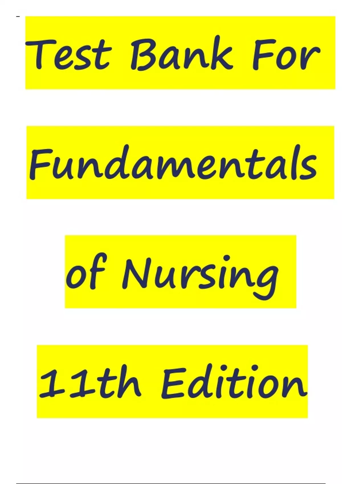Test Bank For Fundamentals of Nursing 11th Edition 1.Which nurse most likely kept records on sanitation techniques and the effects on health? a.Florence Nightingale b.Mary Nutting c.Clara Barton d.Lillian Wald ANS: A Nightingale was the first practicing nurse epidemiologist. Her statistical analyses connected poor sanitation with cholera and dysentery. Mary Nutting, Clara Barton, and Lillian Wald came after Nightingale, each contributing to the nursing profession in her own way. Mary Nutting was instrumental in moving nursing education into universities. Clara Barton founded the American Red Cross. Lillian Wald helped open the Henry Street Settlement. DIF:Understand (comprehension) OBJ:Discuss the influence of social, historical, political, and economic changes on nursing practices. TOP: Evaluation MSC: Health Promotion and Maintenance 2.The nurse prescribes strategies and alternatives to attain expected outcome. Which standard of nursing practice is the nurse following? a.Assessment b.Diagnosis c.Planning d.Implementation ANS: C In planning, the registered nurse develops a plan that prescribes strategies and alternatives to attain expected outcomes. During assessment, the registered nurse collects comprehensive data pertinent to the patient’s health and/or the situation. In diagnosis, the registered nurse analyzes the assessment data to determine the diagnoses or issues. During implementation, the registered nurse implements (carries out) the identified plan. DIF:Understand (comprehension) OBJ:Discuss the development of professional nursing roles. TOP: Planning MSC: Management of Care