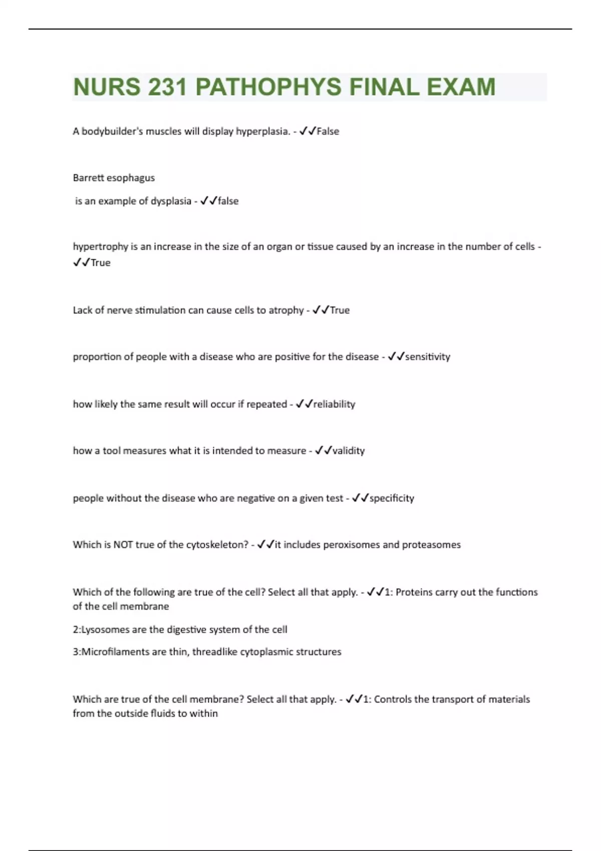 A bodybuilder's muscles will display hyperplasia. - False Barrett esophagus is an example of dysplasia - false hypertrophy is an increase in the size of an organ or tissue caused by an increase in the number of cells - True Lack of nerve stimulation can cause cells to atrophy - True proportion of people with a disease who are positive for the disease - sensitivity how likely the same result will occur if repeated - reliability how a tool measures what it is intended to measure - validity people without the disease who are negative on a given test - specificity Which is NOT true of the cytoskeleton? - it includes peroxisomes and proteasomes Which of the following are true of the cell? Select all that apply. - 1: Proteins carry out the functions of the cell membrane 2:Lysosomes are the digestive system of the cell 3:Microfilaments are thin, threadlike cytoplasmic structures Which are true of the cell membrane? Select all that apply. - 1: Controls the transport of materials from the outside fluids to within2:Helps with the conduction of electrical currents in nerve and muscle cells 3: Aids in the regulation of cell growth and proliferation Which are false of the mitochondria? Select all that apply. - 1: They are found far from the site of energy consumption. 2:They control free radicals. High blood pressure is an example of which of the following? - pathophysiology A patient complains of chest pain and an elevated blood pressure. What are these examples of? - signs and symptoms