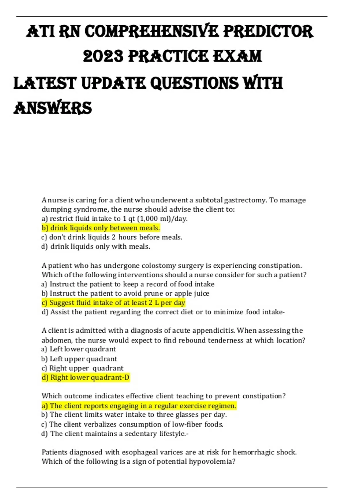 ATI RN COMPREHENSIVE PREDICTOR 2023 PRACTICE EXAM LATEST UPDATE QUESTIONS WITH ANSWERS A nurse is caring for a client who underwent a subtotal gastrectomy. To manage dumping syndrome, the nurse should advise the client to: a) restrict fluid intake to 1 qt (1,000 ml)/day. b) drink liquids only between meals. c) don't drink liquids 2 hours before meals. d) drink liquids only with meals. A patient who has undergone colostomy surgery is experiencing constipation. Which of the following interventions should a nurse consider for such a patient? a) Instruct the patient to keep a record of food intake b) Instruct the patient to avoid prune or apple juice c) Suggest fluid intake of at least 2 L per day d) Assist the patient regarding the correct diet or to minimize food intake- A client is admitted with a diagnosis of acute appendicitis. When assessing the abdomen, the nurse would expect to find rebound tenderness at which location? a) Left lower quadrant b) Left upper quadrant c) Right upper quadrant d) Right lower quadrant-D Which outcome indicates effective client teaching to prevent constipation? a) The client reports engaging in a regular exercise regimen. b) The client limits water intake to three glasses per day. c) The client verbalizes consumption of low-fiber foods. d) The client maintains a sedentary lifestyle.- Patients diagnosed with esophageal varices are at risk for hemorrhagic shock. Which of the following is a sign of potential hypovolemia? a) Hypotension b) Bradycardia c) Warm moist skin d) Polyuria- The nurse is assessing a client with a bleeding gastric ulcer. When examining the client's stool, which of the following characteristics would the nurse be most likely to find? a) Green color and texture b) Black and tarry appearance c) Clay-like quality d) Bright red blood in stool- After teaching a group of students about the various organs of the upper gastrointestinal tract and possible disorders, the instructor determines that the teaching was successful when the students identify which of the following structures as possibly being affected? a) Large intestine b) Ileum c) Stomach d) Liver- A nurse is caring for a client with active upper GI bleeding. What is the appropriate diet for this client during the first 24 hours after admission? a) Skim milk b) Nothing by mouth c) Regular diet d) Clear liquids- The nurse is supervising the staff providing care for an 18-month-old hospitalized with hepatitis A. The nurse determines that the staff's care is appropriate if which of the following is observed? 1. The child is placed in a private room. When using restraints for an agitated/aggressive patient, which of the following statements should NOT influence the nurse's actions during this intervention? 3. The patient's voluntary/involuntary status. The nurse is caring for an 80-year-old client with Parkinson's disease. Which of the following nursing goals is MOST realistic and appropriate in planning care for this client? 2. Maintain optimal function within the client's limitations. A client with a peptic ulcer had a partial gastrectomy and vagotomy (Billroth I). In planning the discharge teaching, the client should be cautioned by the nurse about which of the following? 4. Avoid eating large meals that are high in simple sugars and liquids.-4
