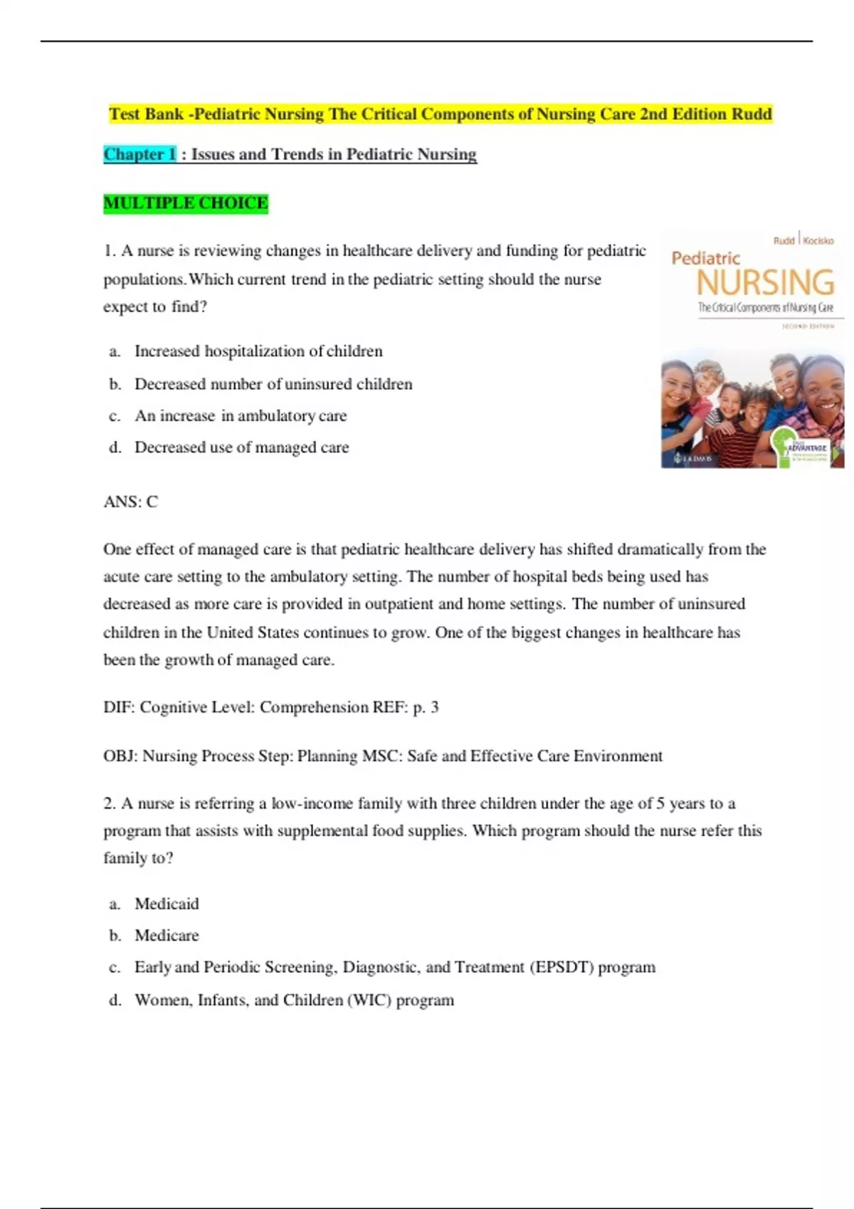 Pediatric Nursing The Critical Components of Nursing Care 2nd Edition Test Bank by Rudd