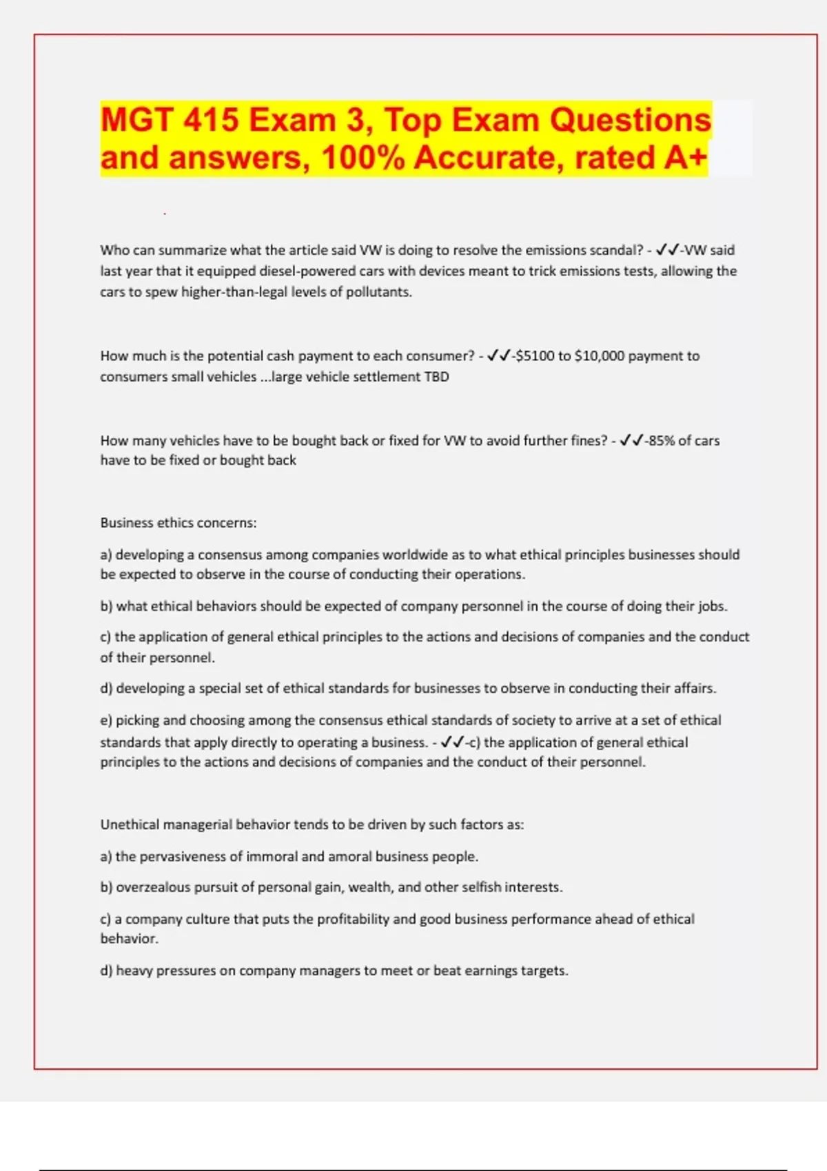 MGT 415 Exam 3, Top Exam Questions and answers, 100% Accurate, rated A+ Who can summarize what the article said VW is doing to resolve the emissions scandal? - -VW said last year that it equipped diesel-powered cars with devices meant to trick emissions tests, allowing the cars to spew higher-than-legal levels of pollutants. How much is the potential cash payment to each consumer? - -$5100 to $10,000 payment to consumers small vehicles ...large vehicle settlement TBD How many vehicles have to be bought back or fixed for VW to avoid further fines? - -85% of cars have to be fixed or bought back Business ethics concerns: a) developing a consensus among companies worldwide as to what ethical principles businesses should be expected to observe in the course of conducting their operations. b) what ethical behaviors should be expected of company personnel in the course of doing their jobs. c) the application of general ethical principles to the actions and decisions of companies and the conduct of their personnel. d) developing a special set of ethical standards for businesses to observe in conducting their affairs. e) picking and choosing among the consensus ethical standards of society to arrive at a set of ethical standards that apply directly to operating a business. - -c) the application of general ethical principles to the actions and decisions of companies and the conduct of their personnel. Unethical managerial behavior tends to be driven by such factors as: a) the pervasiveness of immoral and amoral business people. b) overzealous pursuit of personal gain, wealth, and other selfish interests. c) a company culture that puts the profitability and good business performance ahead of ethical behavior. d) heavy pressures on company managers to meet or beat earnings targets. e) All of these. - -e) All of these. Which of the following represents a justifiable reason for why a company's strategy should be ethical? a) An unethical strategy reflects badly on the character of the company personnel involved. b) A strategy that is unethical in whole or in part is morally wrong. c) Pursuing an unethical strategy damages a company's reputation and can have costly consequences. d) An ethical strategy is good business and is in the best interest of shareholders. e) All of these. - -e) All of these. The three dimensions of performance are often referred to in terms of the "three pillars" and include: a) People, planet, and profit. b) People, which refers to the various social initiatives that make up the CSR strategies. c) Planet, which refers to a firm's ecological impact and environmental practices. d) Profit encompasses the economic impact (value and costs) that the company has on society. e) All of these. - -e) All of these. Which of the following is NOT among the principal managerial components of the strategy execution process? a) Building an organization with the competencies, capabilities, and resource strengths needed to execute strategy successfully. b) Instituting policies and procedures that facilitate rather than impede strategy execution. c) Deciding which core competencies and value chain activities to leave as is and which ones to overhaul and improve. d) Adopting best practices and pushing for continuous improvement in how value chain activities are performed. e) Tying rewards directly to the achievement of strategic and financial targets and to good strategy execution. - -c) Deciding which core competencies and value chain activities to leave as is and which ones to overhaul and improve. The three components