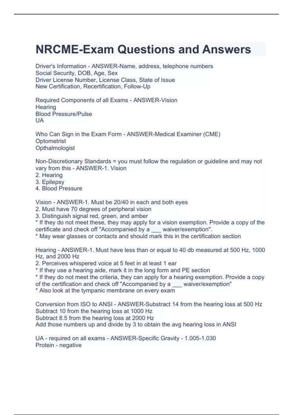 NRCME-Exam Questions and Answers Driver's Information - ANSWER-Name, address, telephone numbers Social Security, DOB, Age, Sex Driver License Number, License Class, State of Issue New Certification, Recertification, Follow-Up Required Components of all Exams - ANSWER-Vision Hearing Blood Pressure/Pulse UA Who Can Sign in the Exam Form - ANSWER-Medical Examiner (CME) Optometrist Opthalmologist Non-Discretionary Standards = you must follow the regulation or guideline and may not vary from this - ANSWER-1. Vision 2. Hearing 3. Epilepsy 4. Blood Pressure Vision - ANSWER-1. Must be 20/40 in each and both eyes 2. Must have 70 degrees of peripheral vision 3. Distinguish signal red, green, and amber * If they do not meet these, they may apply for a vision exemption. Provide a copy of the certificate and check off