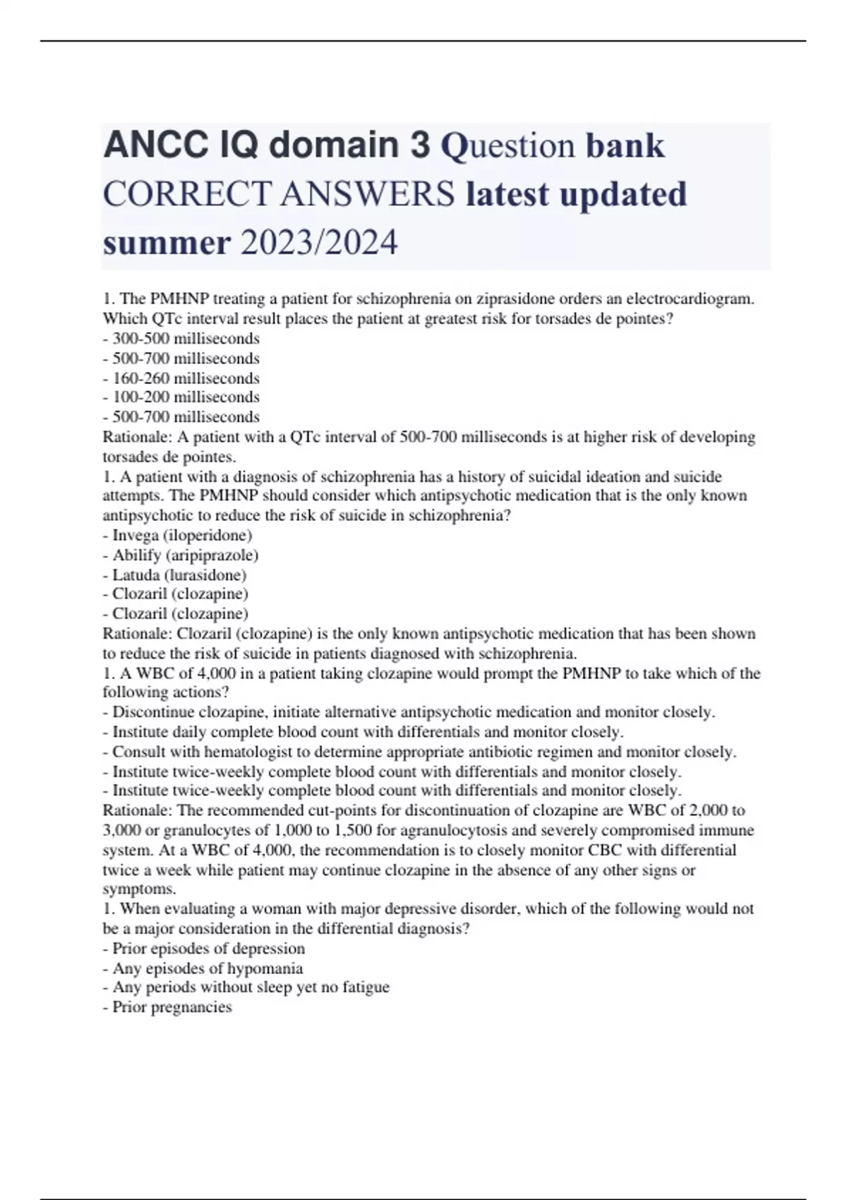 The PMHNP treating a patient for schizophrenia on ziprasidone orders an electrocardiogram. Which QTc interval result places the patient at greatest risk for torsades de pointes? - 300-500 milliseconds - 500-700 milliseconds - 160-260 milliseconds - 100-200 milliseconds - 500-700 milliseconds Rationale: A patient with a QTc interval of 500-700 milliseconds is at higher risk of developing torsades de pointes. 1. A patient with a diagnosis of schizophrenia has a history of suicidal ideation and suicide attempts. The PMHNP should consider which antipsychotic medication that is the only known antipsychotic to reduce the risk of suicide in schizophrenia? - Invega (iloperidone) - Abilify (aripiprazole) - Latuda (lurasidone) - Clozaril (clozapine) - Clozaril (clozapine) Rationale: Clozaril (clozapine) is the only known antipsychotic medication that has been shown to reduce the risk of suicide in patients diagnosed with schizophrenia. 1. A WBC of 4,000 in a patient taking clozapine would prompt the PMHNP to take which of the following actions? - Discontinue clozapine, initiate alternative antipsychotic medication and monitor closely. - Institute daily complete blood count with differentials and monitor closely. - Consult with hematologist to determine appropriate antibiotic regimen and monitor closely. - Institute twice-weekly complete blood count with differentials and monitor closely. - Institute twice-weekly complete blood count with differentials and monitor closely