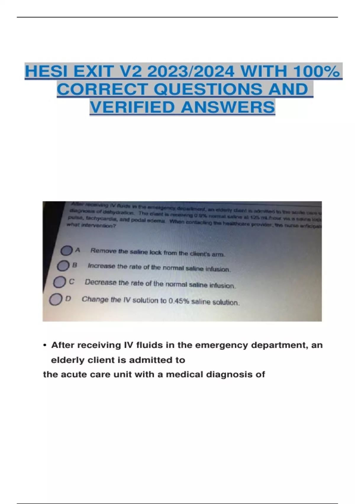 HESI EXIT V2 2023/2024 WITH 100% CORRECT QUESTIONS AND VERIFIED ANSWERS • After receiving IV fluids in the emergency department, an elderly client is admitted to the acute care unit with a medical diagnosis of dehydration. The client is receiving 0.9% normal saline at 125 ml/hour via saline lock and has a bounding pulse, tachycardia, and pedal edema. When contacting the healthcare provider, the nurse anticipates a prescription what intervention? A) Remove the saline lock from the client’s arm. B) Increase the rate of the normal saline infusion. C) Decrease the rate of the normal saline infusion. D) Change the IV solution to 0.45% saline solution. • A client who is admitted to the care unit with syndrome of inappropriate antidiuretic hormone (SIADH) has developed osmotic demyelination. Which intervention should the nurse implement first? A) Patch one eye. B) Evaluate swallow. C) Reorient often. • The nurse is preparing a client who had a below-theknee (BKA) amputation for discharge to home. Which recommendations should the nurse provide this client? (Select all that apply) A) Wash the stump with soap and water. B) Avoid range of motion exercise. C) Apply alcohol to the stump after bathing. D) Inspect skin for redness. E) Use a residual limb shrinker. • After 2 days treatment for dehydration, a child continues to vomit and have diarrhea. Normal saline is infusing and the child’s urine output is 50ml/hour. During morning assessment, the nurse determines that the child is lethargic and difficult to arouse. Which should the nurse implement? A) Increase the IV fluid flow rate. B) Review 24-hour intake and output. C) Obtain arterial blood gases. D) Perform a finger stick glucose test. • A client with bleeding esophageal varices receives vasopressin IV. What should the nurse monitor for during the IV infusion of this medication? A) Vasodilatation of the extremities. B) Chest pain and dysrhythmia. C) Hypotension and tachycardia. D) Range of motion. D) Decreasing GI cramping and nausea