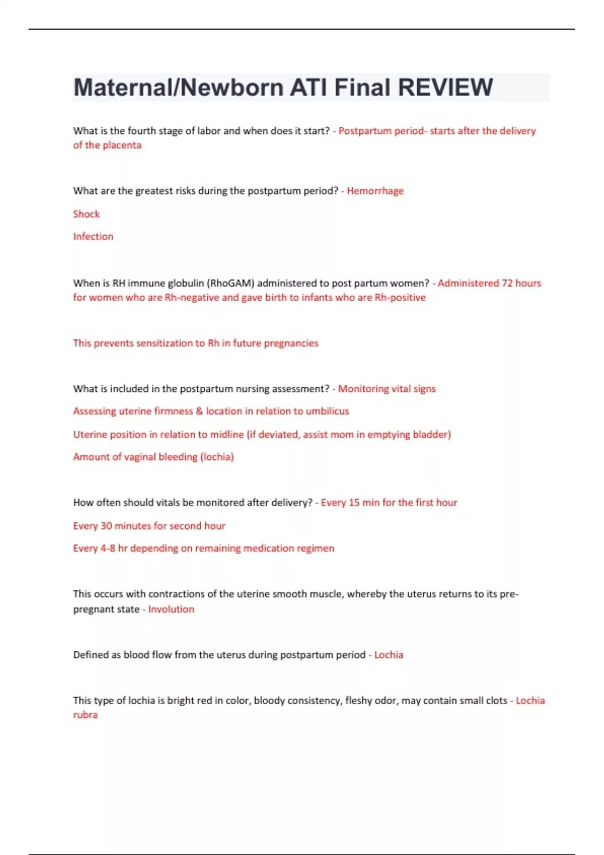 What is the fourth stage of labor and when does it start? - Postpartum period- starts after the delivery of the placenta What are the greatest risks during the postpartum period? - Hemorrhage Shock Infection When is RH immune globulin (RhoGAM) administered to post partum women? - Administered 72 hours for women who are Rh-negative and gave birth to infants who are Rh-positive This prevents sensitization to Rh in future pregnancies What is included in the postpartum nursing assessment? - Monitoring vital signs Assessing uterine firmness & location in relation to umbilicus Uterine position in relation to midline (if deviated, assist mom in emptying bladder) Amount of vaginal bleeding (lochia) How often should vitals be monitored after delivery? - Every 15 min for the first hour Every 30 minutes for second hour Every 4-8 hr depending on remaining medication regimen This occurs with contractions of the uterine smooth muscle, whereby the uterus returns to its prepregnant state - Involution Defined as blood flow from the uterus during postpartum period - Lochia This type of lochia is bright red in color, bloody consistency, fleshy odor, may contain small clots - Lochia rubraThis type of lochia is pinkish brown in color & serosanguineous consistency - Lochia serosa This type of lochia is yellowish, white creamy color, fleshy odor - Lochia alba When is colostrum present in the new mother's breasts? - During pregnancy and 2-3 days immediately after birth Defined as an infection in a milk duct of the breast with concurrent flulike symptoms - Mastitis What are therapeutic and approved holding positions when breast feeding? - Cradle hold Side-lying hold Football hold What does breast feeding cause the release of? What does this prevent? - Breast feeding causes the release of oxytocin which stimulates uterine contractions (will prevent hemorrhage) What are normal lab values in the post partum period? - Increased Hct & Hgb up to 72 hours Leukocytosis (WBC count up to 20,000-25,000 for the first 10-14 days, without presence of infection) Increased coagulation factors Increased fibrinogen A medical condition during pregnancy defined as excessive nausea and vomiting that is prolonged past 12 weeks of gestation. Results in weight loss & electrolyte imbalance - Hyperemesis gravidarum What are nursing responsibilities when caring for a patient diagnosed with hyperemesis gravidarum? - Monitor client's I&O Assess client's skin turgor/mucous membranes Monitor vital signs