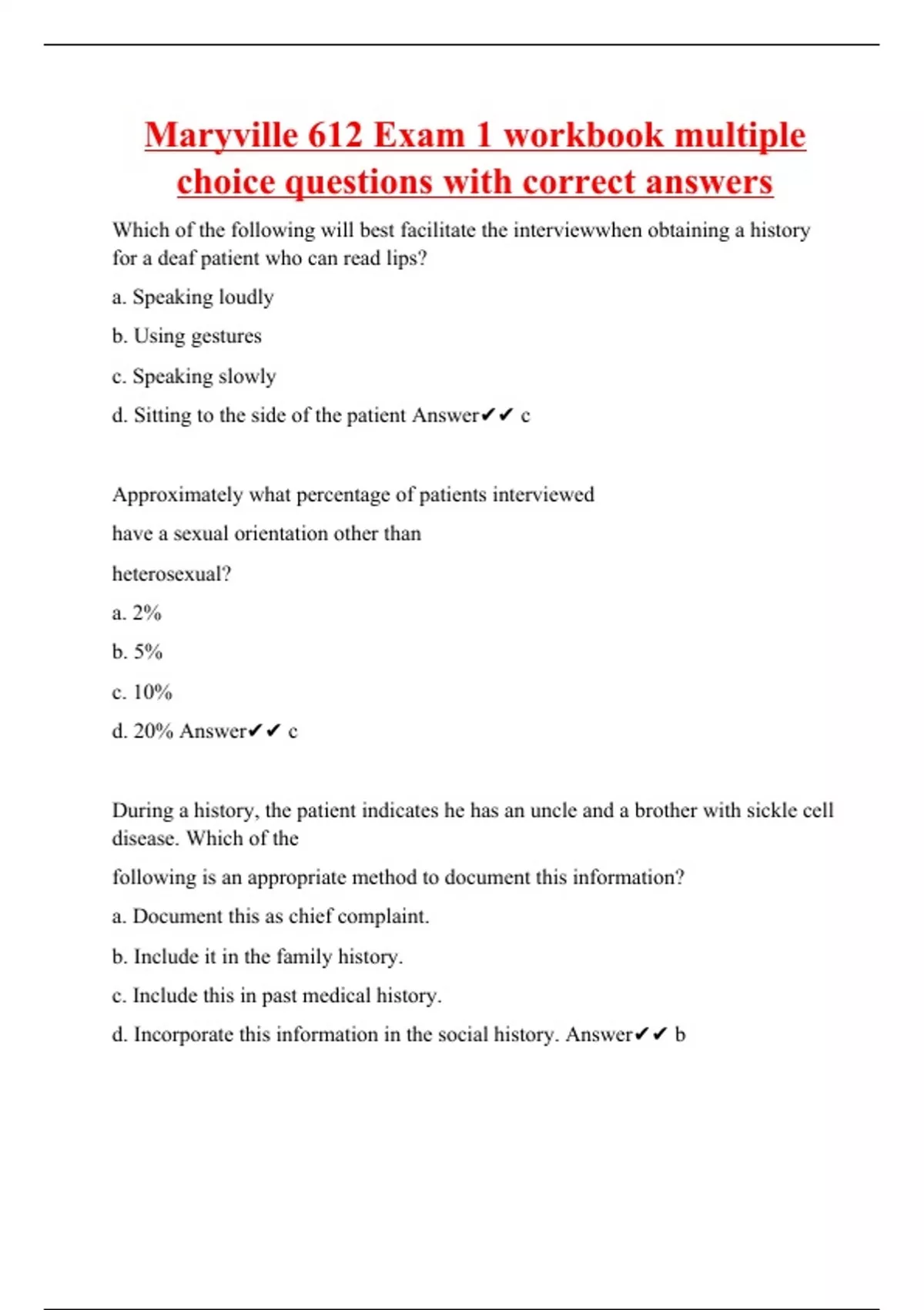 Which of the following will best facilitate the interviewwhen obtaining a history for a deaf patient who can read lips? a. Speaking loudly b. Using gestures c. Speaking slowly d. Sitting to the side of the patient Answer c Approximately what percentage of patients interviewed have a sexual orientation other than heterosexual? a. 2% b. 5% c. 10% d. 20% Answer c During a history, the patient indicates he has an uncle and a brother with sickle cell disease. Which of the following is an appropriate method to document this information? a. Document this as chief complaint. b. Include it in the family history. c. Include this in past medical history. d. Incorporate this information in the social history. Answer b