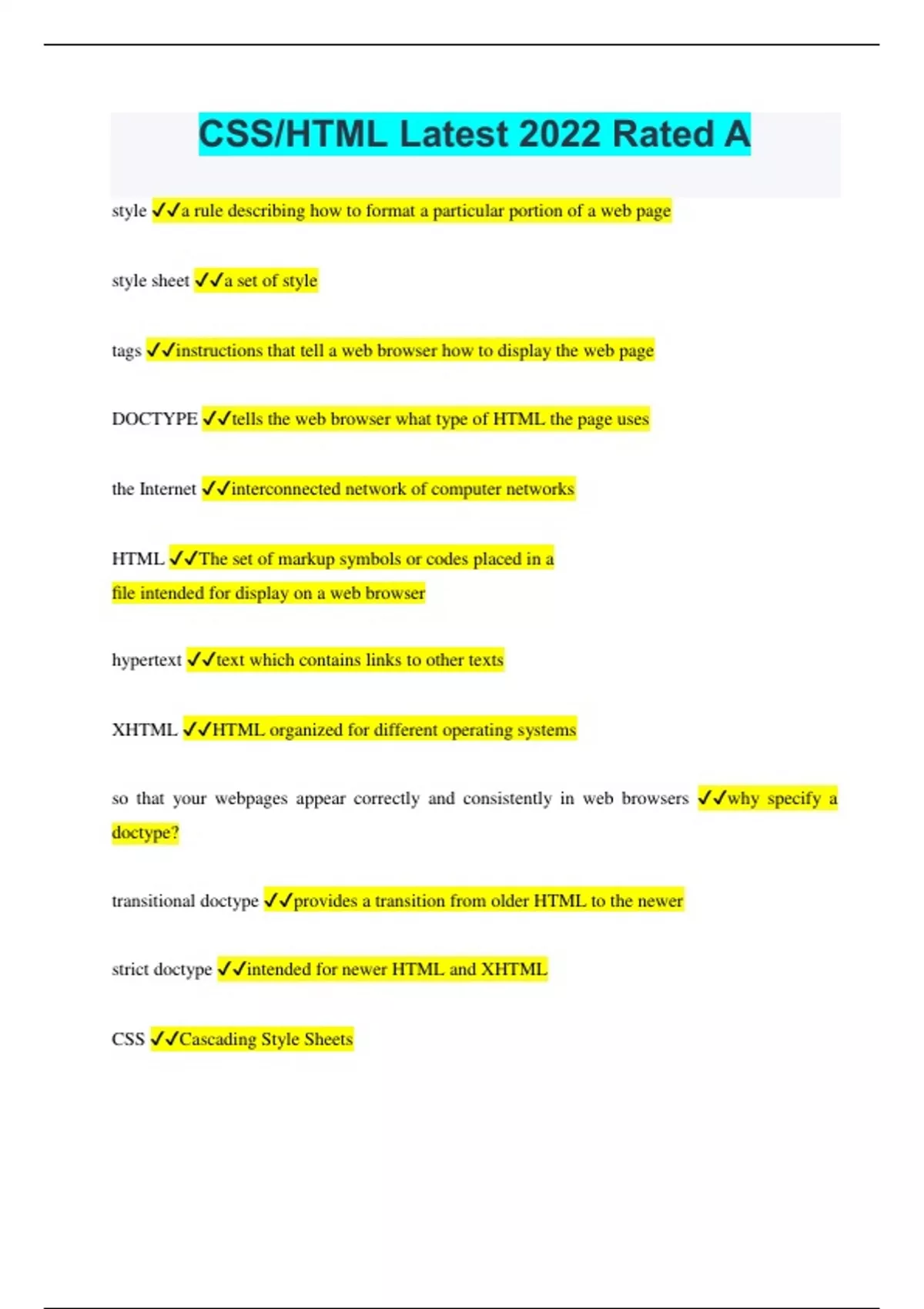 style a rule describing how to format a particular portion of a web page style sheet a set of style tags instructions that tell a web browser how to display the web page DOCTYPE tells the web browser what type of HTML the page uses the Internet interconnected network of computer networks HTML The set of markup symbols or codes placed in a file intended for display on a web browser hypertext text which contains links to other texts XHTML HTML organized for different operating systems so that your webpages appear correctly and consistently in web browsers why specify a doctype? transitional doctype provides a transition from older HTML to the newer strict doctype intended for newer HTML and XHTML CSS Cascading Style SheetsCSS gives you creative control over the layout and design of your web pages What are advantages of using CSS? internal style sheets a collection of style that's part of the web page's code external style sheets a text file containing all your CSS rules inline style sheets CSS rules put directly into a page's HTML RGB colors color value consisting of three numbers representing either percentages or numbers between 0 and 255 for each hue hue red, green, or bl