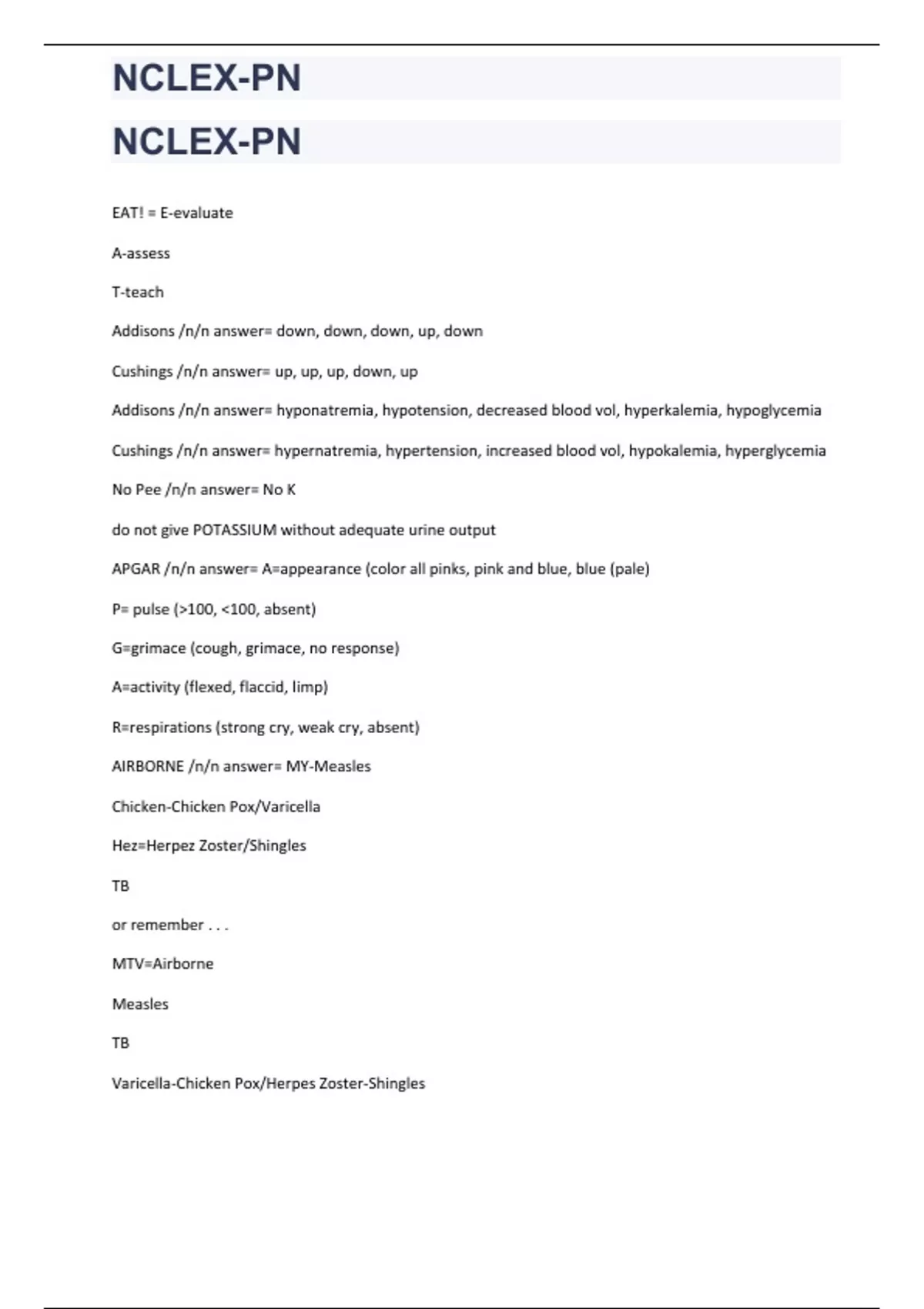 NCLEX Pn 2023 EAT! = E-evaluate A-assess T-teach Addisons Cushings