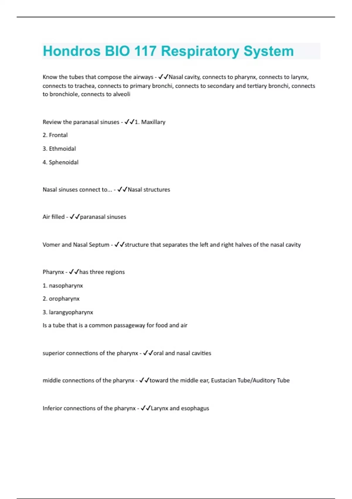 Know the tubes that compose the airways - Nasal cavity, connects to pharynx, connects to larynx, connects to trachea, connects to primary bronchi, connects to secondary and tertiary bronchi, connects to bronchiole, connects to alveoli Review the paranasal sinuses - 1. Maxillary 2. Frontal 3. Ethmoidal 4. Sphenoidal Nasal sinuses connect to... - Nasal structures Air filled - paranasal sinuses Vomer and Nasal Septum - structure that separates the left and right halves of the nasal cavity Pharynx - has three regions 1. nasopharynx 2. oropharynx 3. larangyopharynx Is a tube that is a common passageway for food and air superior connections of the pharynx - oral and nasal cavities middle connections of the pharynx - toward the middle ear, Eustacian Tube/Auditory Tube Inferior connections of the pharynx - Larynx and esophagusPalatine tonsils - tonsils on the two sides of the oropharynx Pharangeal Tonsils - Tonsil that sit on top of the nasopharynx Larynx - innervated by CN X Vagus 3 pieces of Cartilage 1. Thyroid Cartilage 2. Epiglottis 3. Crickoid Cartilage Holds the vocal cords, opening in between is called the Glottis Thyroid Cartilage - largest cartilage of the larynx that forms the adam's apple in men