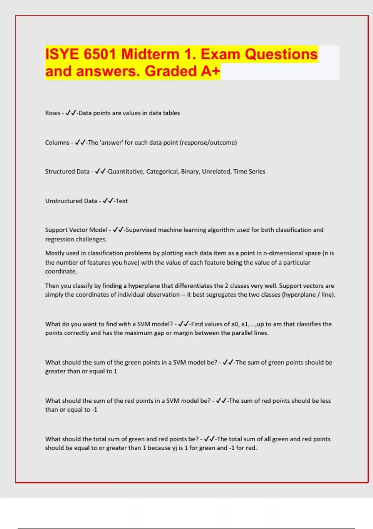ISYE 6501 Midterm 1. Exam Questions and answers. Graded A+ Rows - -Data points are values in data tables Columns - -The 'answer' for each data point (response/outcome) Structured Data - -Quantitative, Categorical, Binary, Unrelated, Time Series Unstructured Data - -Text Support Vector Model - -Supervised machine learning algorithm used for both classification and regression challenges. Mostly used in classification problems by plotting each data item as a point in n-dimensional space (n is the number of features you have) with the value of each feature being the value of a particular coordinate. Then you classify by finding a hyperplane that differentiates the 2 classes very well. Support vectors are simply the coordinates of individual observation -- it best segregates the two classes (hyperplane / line). What do you want to find with a SVM model? - -Find values of a0, a1,...,up to am that classifies the points correctly and has the maximum gap or margin between the parallel lines. What should the sum of the green points in a SVM model be? - -The sum of green points should be greater than or equal to 1 What should the sum of the red points in a SVM model be? - -The sum of red points should be less than or equal to -1 What should the total sum of green and red points be? - -The total sum of all green and red points should be equal to or greater than 1 because yj is 1 for green and -1 for red. First principal component - -PCA -- a linear combination of original predictor variables which captures the maximum variance in the data set. It determines the direction of highest variability in the data. Larger the variability captured in first component, larger the information captured by component. No other component can have variability higher than first principal component. it minimizes the sum of squared distance between a data point and the line. Second principal component - -PCA -- also a linear combination of original predictors which captures the remaining variance in the data set and is uncorrelated with Z¹. In other words, the correlation between first and second component should is zero. What if it's not possible to separate green and red points in a SVM model? - -Utilize a soft classifier -- In a soft classification context, we might add an extra multiplier for each type of error with a larger penalty, the less we want to accept mis-classifying that type of point. Soft Classifier - -Account for errors in SVM classification. Trading off minimizing errors we make and maximizing the margin. To trade off between them, we pick a lambda value and minimize a combination of error and margin. As lambda gets large, this term gets large. The importance of a large margin outweighs avoiding mistakes and classifying known data points. Should you scale your data in a SVM model? - -Yes, so the orders of magnitude are approximately the same.