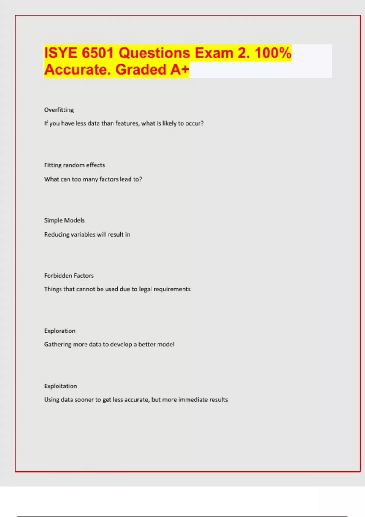 ISYE 6501 Questions Exam 2. 100% Accurate. Graded A+ Overfitting If you have less data than features, what is likely to occur? Fitting random effects What can too many factors lead to? Simple Models Reducing variables will result in