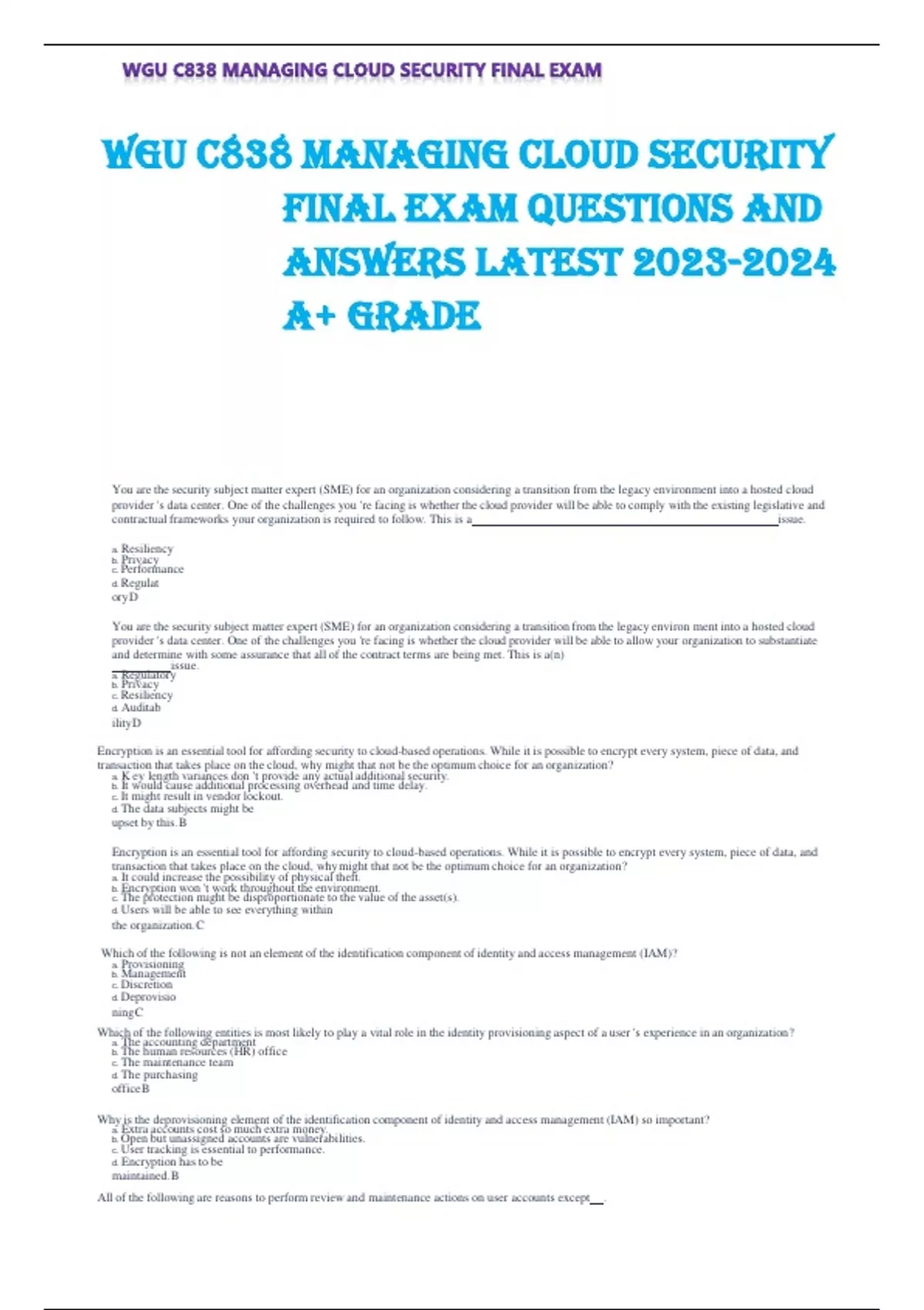 WGU C838 MANAGING CLOUD SECURITY FINAL EXAM QUESTIONS AND ANSWERS LATEST A+ GRADE You are the security subject matter expert (SME) for an organization considering a transition from the legacy environment into a hosted cloud provider 's data center. One of the challenges you 're facing is whether the cloud provider will be able to comply with the existing legislative and contractual frameworks your organization is required to follow. This is a issue. a. Resiliency b. Privacy c. Performance d. Regulatory D You are the security subject matter expert (SME) for an organization considering a transition from the legacy environ ment into a hosted cloud provider 's data center. One of the challenges you 're facing is whether the cloud provider will be able to allow your organization to substantiate and determine with some assurance that all of the contract terms are being met. This is a(n) issue. a. Regulatory b. Privacy c. Resiliency d. Auditability D Encryption is an essential tool for affording security to cloud-based operations. While it is possible to encrypt every system, piece of data, and transaction that takes place on the cloud, why might that not be the optimum choice for an organization? a. K ey length variances don 't provide any actual additional security. b. It would cause additional processing overhead and time delay. c. It might result in vendor lockout. d. The data subjects might be upset by this. B Encryption is an essential tool for affording security to cloud-based operations. While it is possible to encrypt every system, piece of data, and transaction that takes place on the cloud, why might that not be the optimum choice for an organization? a. It could increase the possibility of physical theft. b. Encryption won 't work throughout the environment. c. The protection might be disproportionate to the value of the asset(s). d. Users will be able to see everything within the organization. C Which of the following is not an element of the identification component of identity and access management (IAM)? a. Provisioning b. Management c. Discretion d. Deprovisioning C Which of the following entities is most likely to play a vital role in the identity provisioning aspect of a user 's experience in an organization? a. The accounting department b. The human resources (HR) office c. The maintenance team d. The purchasing office B Why is the deprovisioning element of the identification component of identity and access management (IAM) so important? a. Extra accounts cost so much extra money. b. Open but unassigned accounts are vulnerabilities. c. User tracking is essential to performance. d. Encryption has to be maintained. B All of the following are reasons to perform review and maintenance actions on user accounts except .