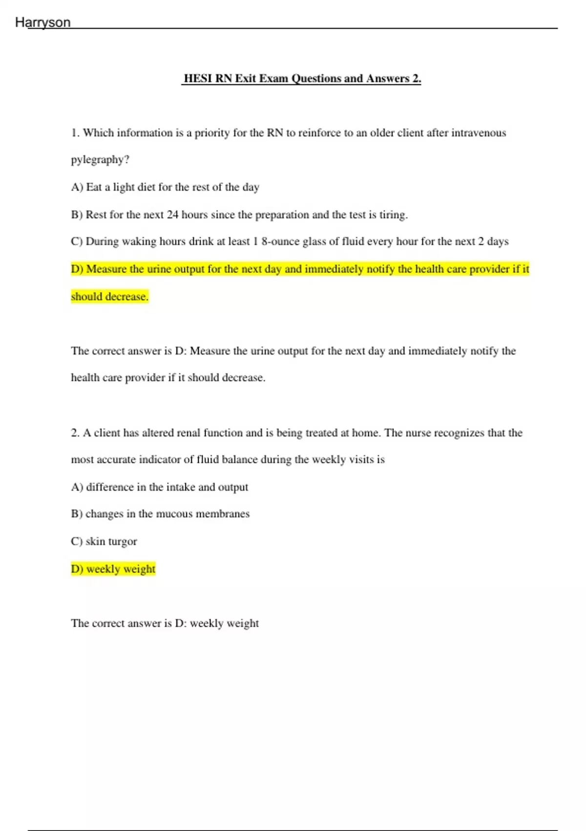HESI RN Exit Exam Questions and Answers 2. 1. Which information is a priority for the RN to reinforce to an older client after intravenous pylegraphy? A) Eat a light diet for the rest of the day B) Rest for the next 24 hours since the preparation and the test is tiring. C) During waking hours drink at least 1 8-ounce glass of fluid every hour for the next 2 days D) Measure the urine output for the next day and immediately notify the health care provider if it should decrease. The correct answer is D: Measure the urine output for the next day and immediately notify the health care provider if it should decrease. 2. A client has altered renal function and is being treated at home. The nurse recognizes that the most accurate indicator of fluid balance during the weekly visits is A) difference in the intake and output B) changes in the mucous membranes C) skin turgor D) weekly weight