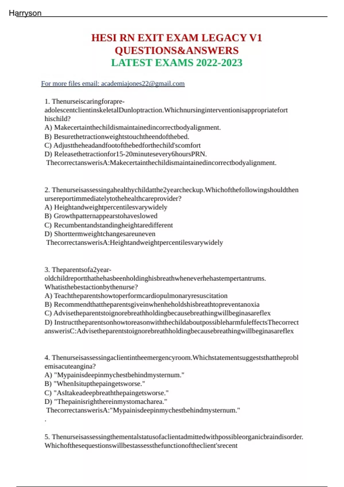 HESI RN EXIT EXAM LEGACY V1-QHESI RN EXIT EXAM LEGACY V1 QUESTIONS&ANSWERS LATEST EXAMS For more files email: 1. ThenurseiscaringforapreadolescentclientinskeletalDunloptraction.Whichnursinginterventionisappropriatefort hischild? A) Makecertainthechildismaintainedincorrectbodyalignment. B) Besurethetractionweightstouchtheendofthebed. C) Adjusttheheadandfootofthebedforthechild'scomfort D) Releasethetractionfor15-20minutesevery6hoursPRN. ThecorrectanswerisA:Makecertainthechildismaintainedincorrectbodyalignment. 2. Thenurseisassessingahealthychildatthe2yearcheckup.Whichofthefollowingshouldthen ursereportimmediatelytothehealthcareprovider? A) Heightandweightpercentilesvarywidely B) Growthpatternappearstohaveslowed C) Recumbentandstandingheightaredifferent D) Shorttermweightchangesareuneven ThecorrectanswerisA:Heightandweightpercentilesvarywidely 3. Theparentsofa2yearoldchildreportthathehasbeenholdinghisbreathwheneverhehastempertantrums. Whatisthebestactionbythenurse? A) Teachtheparentshowtoperformcardiopulmonaryresuscitation B) Recommendthattheparentsgiveinwhenheholdshisbreathtopreventanoxia C) Advisetheparentstoignorebreathholdingbecausebreathingwillbeginasareflex D) InstructtheparentsonhowtoreasonwiththechildaboutpossibleharmfuleffectsThecorrect answerisC:Advisetheparentstoignorebreathholdingbecausebreathingwillbeginasareflex uestions&A
