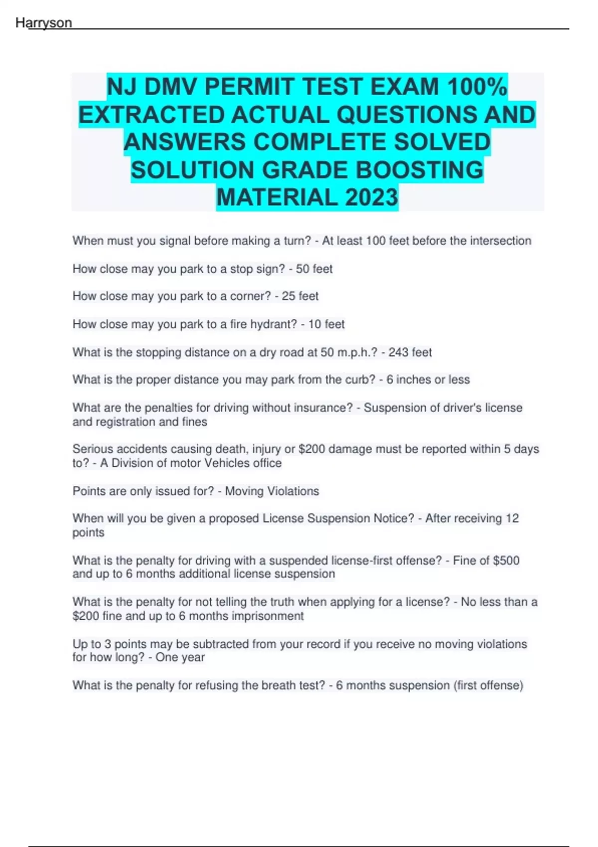cc ati teas 7 science test exam NJ DMV PERMIT TEST EXAM 100% EXTRACTED ACTUAL QUESTIONS AND ANSWERS COMPLETE SOLVED SOLUTION GRADE BOOSTING MATERIAL 2023 When must you signal before making a turn? - At least 100 feet before the intersection How close may you park to a stop sign? - 50 feet How close may you park to a corner? - 25 feet How close may you park to a fire hydrant? - 10 feet What is the stopping distance on a dry road at 50 m.p.h.? - 243 feet What is the proper distance you may park from the curb? - 6 inches or less What are the penalties for driving without insurance? - Suspension of driver's license and registration and fines Serious accidents causing death, injury or $200 damage must be reported within 5 days to? - A Division of motor Vehicles office Points are only issued for? - Moving Violations When will you be given a proposed License Suspension Notice? - After receiving 12 points What is the penalty for driving with a suspended license-first offense? - Fine of $500 and up to 6 months additional license suspension What is the penalty for not telling the truth when applying for a license? - No less than a $200 fine and up to 6 months imprisonment Up to 3 points may be subtracted from your record if you receive no moving violations for how long? - One year What is the penalty for refusing the breath test? - 6 months suspension (first offense)