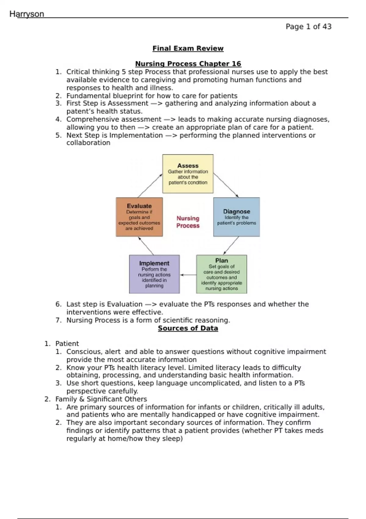 NUR 100 Final Exam (1).docx Final Exam Review Nursing Process Chapter 16 1. Critical thinking 5 step Process that professional nurses use to apply the best available evidence to caregiving and promoting human functions and responses to health and illness. 2. Fundamental blueprint for how to care for patients 3. First Step is Assessment —> gathering and analyzing information about a patent’s health status. 4. Comprehensive assessment —> leads to making accurate nursing diagnoses, allowing you to then —> create an appropriate plan of care for a patient. 5. Next Step is Implementation —> performing the planned interventions or collaboration 6. Last step is Evaluation —> evaluate the PTs responses and whether the interventions were effective. 7. Nursing Process is a form of scientific reasoning. Sources of Data 1. Patient 1. Conscious, alert and able to answer questions without cognitive impairment provide the most accurate information 2. Know your PTs health literacy level. Limited literacy leads to difficulty obtaining, processing, and understanding basic health information. 3. Use short questions, keep language uncomplicated, and listen to a PTs perspective carefully. 2. Family & Significant Others 1. Are primary sources of information for infants or children, critically ill adults, and patients who are mentally handicapped or have cognitive impairment. 2. They are also important secondary sources of information. They confirm findings or identify patterns that a patient provides (whether PT takes meds regularly at home/how they sleep)
