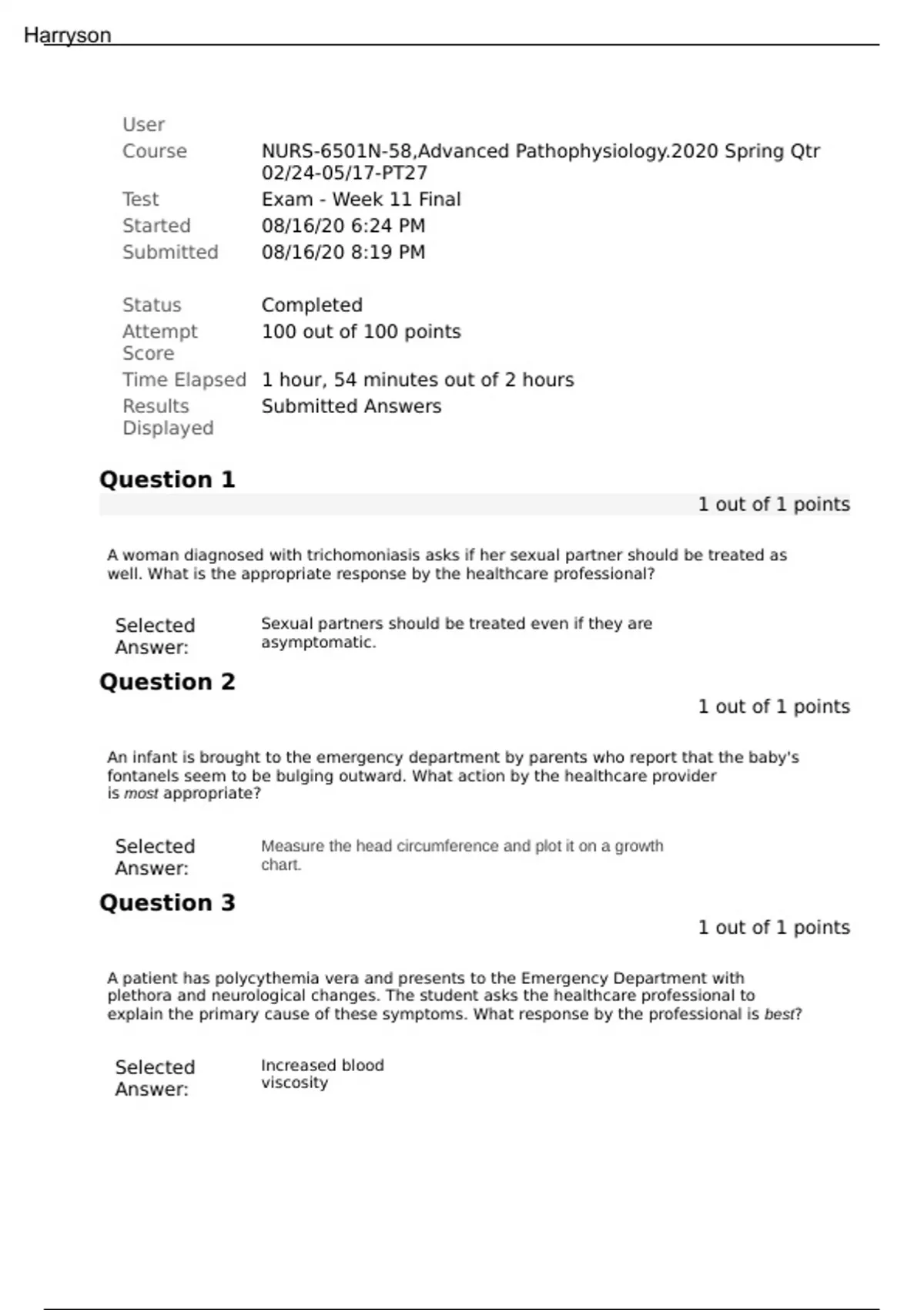 NURS-6501N-58,Advanced Pathophysiology.2020 Spring Qtr 02/24-05/17-PT27 Test Exam - Week 11 Final Started 08/16/20 6:24 PM Submitted 08/16/20 8:19 PM Status Completed Attempt Score 100 out of 100 points Time Elapsed 1 hour, 54 minutes out of 2 hours Results Displayed Submitted Answers Question 1 1 out of 1 points A woman diagnosed with trichomoniasis asks if her sexual partner should be treated as well. What is the appropriate response by the healthcare professional? Selected Answer: Sexual partners should be treated even if they are asymptomatic. Question 2 1 out of 1 points An infant is brought to the emergency department by parents who report that the baby's fontanels seem to be bulging outward. What action by the healthcare provider is most appropriate? Selected Answer: Measure the head circumference and plot it on a growth chart. Question 3 1 out of 1 points A patient has polycythemia vera and presents to the Emergency Department with plethora and neurological changes. The student asks the healthcare professional to explain the primary cause of these symptoms. What response by the professional is best? Selected Answer: Increased blood viscosity