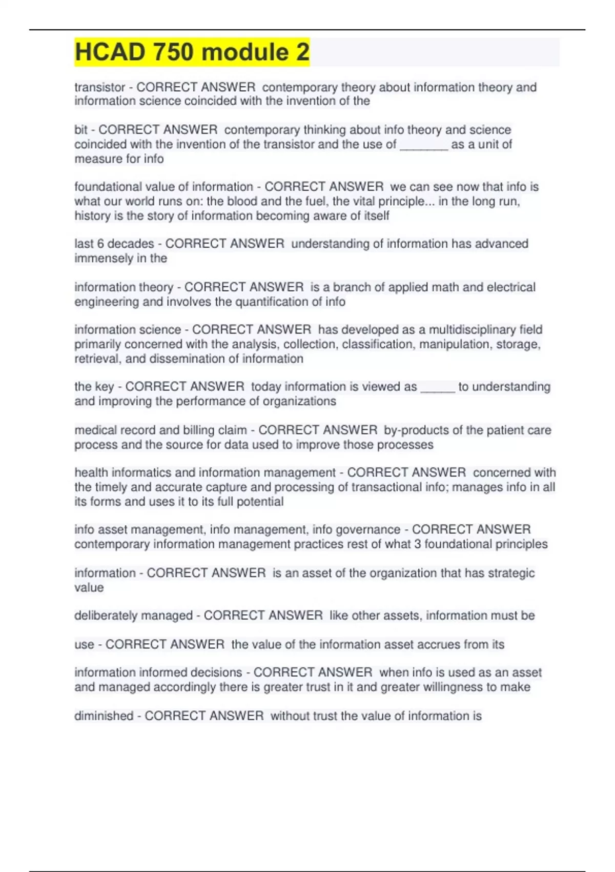 transistor - CORRECT ANSWER contemporary theory about information theory and information science coincided with the invention of the bit - CORRECT ANSWER contemporary thinking about info theory and science coincided with the invention of the transistor and the use of _______ as a unit of measure for info foundational value of information - CORRECT ANSWER we can see now that info is what our world runs on: the blood and the fuel, the vital principle... in the long run, history is the story of information becoming aware of itself .