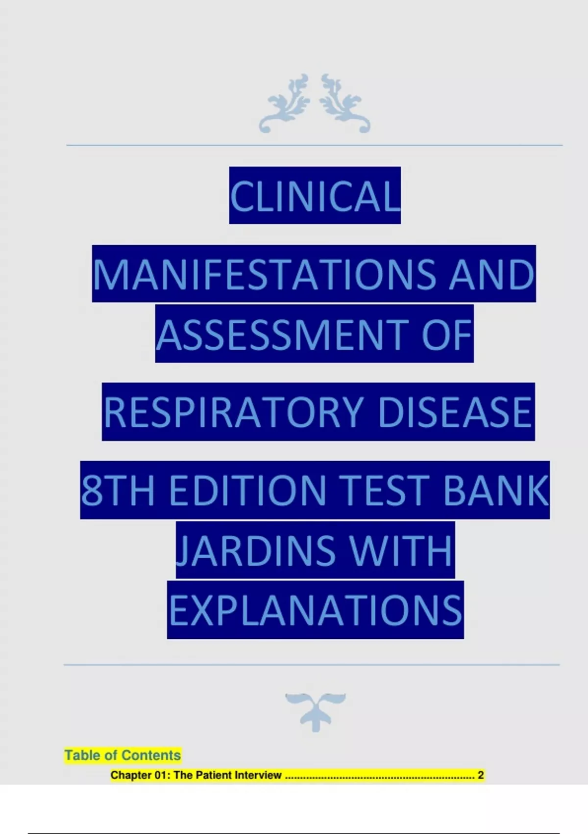 CLINICAL MANIFESTATIONS AND ASSESSMENT OF RESPIRATORY DISEASE 8TH EDITION TEST BANK JARDINS WITH EXPLANATIONS