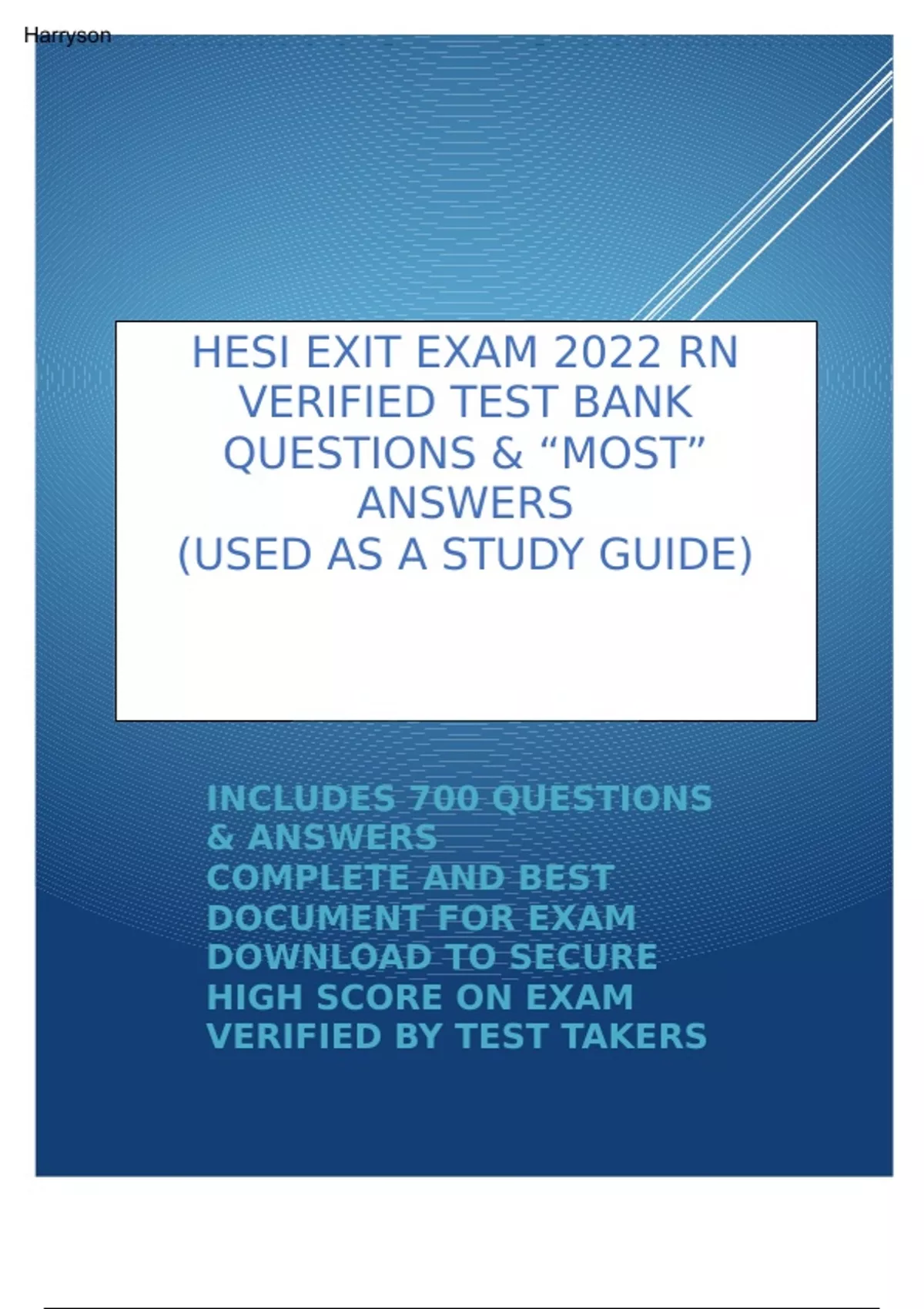 HESI STUDY GUIDE TB EXIT EXAM 2022 (Recovered).dESI EXIT EXAM RN 2022 VERIFIED TEST BANK WITH “MOST” ANSWERS 1.A client with alzheimer’s disease AD is receiving trazodone, a recently prescribed atypical antidepressant. The caregiver tells the home health nurse that he client’s mood and sleep patterns are improved, but there is no change in the cognitive ability. How should the nurse respond to this information? Explain that it may take several weeks for the medication to be effective. Notify the healthcare provider that a change in dosage may be needed Confirm that the desired effect of the medication has been achieved Evaluate when and how the medication is being administered to the client 1.A client who is 32 weeks gestation is seen in the emergency department reporting vision changes. The nurse observes the client has also experienced a rapid weight gain over six weeks. Which action should the nurse implement next? Collect a finger stick blood glucose Check pupils for reactivity Harryson Auscultate fetal heart tones Obtain a blood pressure 2. The nurse observes the external genitalia of a female client in preparation for inserting an indwelling urinary catheter. At what location should the catheter be inserted? Mark your answer on the picture 3. The nurse is preparing administer a histamine 2- receptor antagonist to a client with peptic ulcer disease. What is the primary purpose of this drug classification? Inhibits action of acetylcholine by blocking parasympathetic nerve endings Destroys microorganisms causing stomach inflammation Neutralizes hydrochloric acid HCL in the stomach Decreases the amount of HCL secretion by the parietal cells in the stomach 4. The charge nurse is making assignments on the psychiatric unit for a practical nurse PN and a newly licensed registered nurse RN. Which client should be assigned to the RN? A young male with schizophrenia who says voices are telling him to kill his psychiatrist Harryson A middle aged client who is in the depressive phase of bipolar disease and is receiving lithium An adult client who has been depressed for the past several months and denies suicidal ideation An older male who tells the staff and other clients that he is Superman and can fly 5. The nurse has received funding to design a health promotion project for African-American women at risk for developing breast cancer. Which resource is most important in designing this program? A listing of African-american women who live in the community Morbidity data for breast cancer in women of all races Participation of community leaders in planning the program Technical assistance to produce a video on breast selfexamination 6. The healthcare provider prescribes the antibiotic cefdinir 300 mg PO every 12 hours for a client with postoperative wound infection. Which foods should the nurse encourage this client to eat? Yogurt or buttermilk Green leafy vegetables Fresh fruits Avocados and cheese