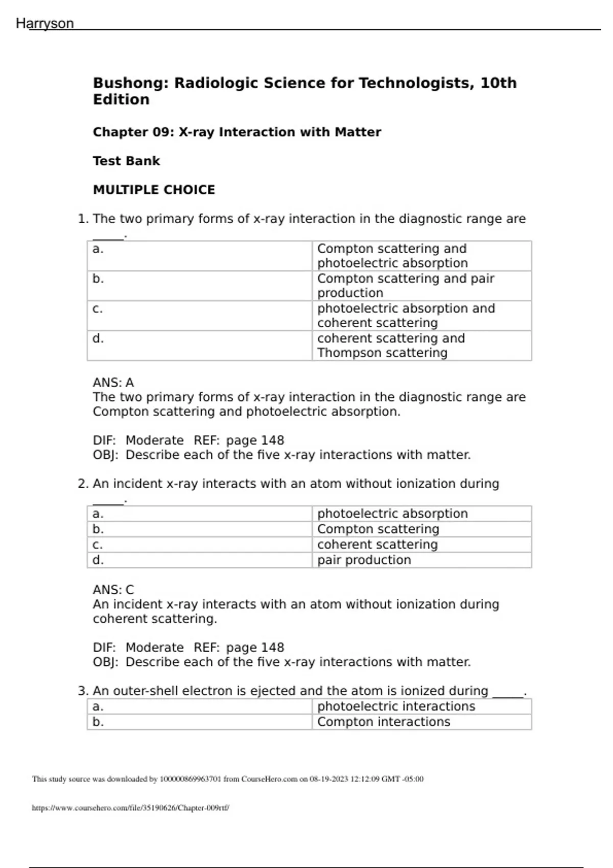 Chapter_Bushong: Radiologic Science for Technologists, 10th Edition Chapter 09: X-ray Interaction with Matter Test Bank MULTIPLE CHOICE 1. The two primary forms of x-ray interaction in the diagnostic range are _____. a. Compton scattering and photoelectric absorption b. Compton scattering and pair production c. photoelectric absorption and coherent scattering d. coherent scattering and Thompson scattering ANS: A The two primary forms of x-ray interaction in the diagnostic range are Compton scattering and photoelectric absorption. DIF: Moderate REF: page 148 OBJ: Describe each of the five x-ray interactions with matter. 2. An incident x-ray interacts with an atom without ionization during _____. a. photoelectric absorption b. Compton scattering c. coherent scattering d. pair production ANS: C An incident x-ray interacts with an atom without ionization during coherent scattering. DIF: Moderate REF: page 148 OBJ: Describe each of the five x-ray interactions with matter. 3. An outer-shell electron is ejected and the atom is ionized during _____. a. photoelectric interactions b. Compton interactions This study source was downloaded by from CourseH on 08-19-2023 12:12:09 GMT -05:00 Harryson c. coherent scattering d. pair production ANS: B An outer-shell electron is ejected and the atom is ionized during Compton interactions. DIF: Moderate REF: page 149 OBJ: Describe each of the five x-ray interactions with matter. 4. Which x-ray interaction involves the ejection of the K-shell electron? a. coherent scattering b. Compton interaction c. pair production d. photoelectric absorption ANS: D Photoelectric absorption involves the ejection of the K-shell electron. DIF: Moderate REF: page 151 OBJ: Describe each of the five x-ray interactions with matter. 5. The scattered x-ray from a Compton interaction usually retains _____ of the energy of the incident photon. a. none b. little c. most d. all ANS: C The scattered x-ray from a Compton interaction usually retains most of the energy of the incident photon. DIF: Moderate REF: page 149 OBJ: Describe each of the five x-ray interactions with matter. 6. Compton scatter is directed at _____ angle from the incident beam. a. a 180° b. a 90° c. a 0° d. any ANS: D Compton scatter is directed at any angle from the incident beam