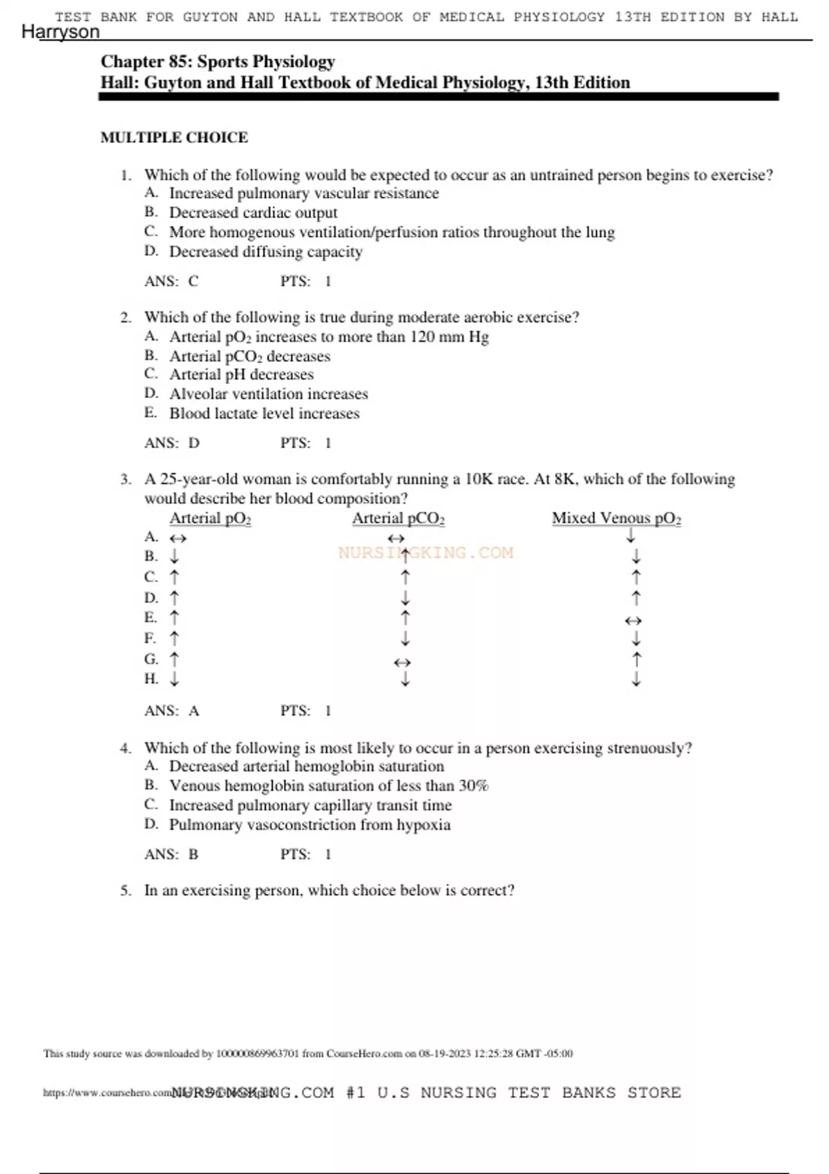 Chapter 85: Sports Physiology Hall: Guyton and Hall Textbook of Medical Physiology, 13th Edition MULTIPLE CHOICE 1. Which of the following would be expected to occur as an untrained person begins to exercise? A. Increased pulmonary vascular resistance B. Decreased cardiac output C. More homogenous ventilation/perfusion ratios throughout the lung D. Decreased diffusing capacity ANS: C PTS: 1 2. Which of the following is true during moderate aerobic exercise? A. Arterial pO2 increases to more than 120 mm Hg B. Arterial pCO2 decreases C. Arterial pH decreases D. Alveolar ventilation increases E. Blood lactate level increases ANS: D PTS: 1 3. A 25-year-old woman is comfortably running a 10K race. At 8K, which of the following would describe her blood composition? Arterial pO2 Arterial pCO2 Mixed Venous pO2 A. B. C. D. E. F. G. H. ANS: A PTS: 1 4. Which of the following is most likely to occur in a person exercising strenuously? A. Decreased arterial hemoglobin saturation B. Venous hemoglobin saturation of less than 30% C. Increased pulmonary capillary transit time D. Pulmonary vasoconstriction from hypoxia ANS: B PTS: 1 5. In an exercising person, which choice below is correct? TEST BANK FOR GUYTON AND HALL TEXTBOOK OF MEDICAL PHYSIOLOGY 13TH EDITION BY HALL NURSINGKING.COM #1 U.S NURSING TEST BANKS STORE This study source was downloaded by from CourseH on 08-19-2023 12:25:28 GMT -05:00 Harryson N U R S I N G K I N G . C O M Arterial Blood Venous Blood A. Figure 1 point C Figure 2 point A B. Figure 1 point C Figure 2 point B C. Figure 1 point D Figure 2 point C D. Figure 1 point D Figure 2 point B E. Figure 1 point E Figure 2 point C F. Figure 1 point E Figure 2 point B ANS: D PTS: 1 6. A 60-year-old male runner is trying to fight old age and increase his aerobic performance in the marathon. Which of the following would help the most? A. Sodium bicarbonate B. Amphetamines C. Anabolic steroids D. Erythropoietin ANS: D PTS: 1 7. A 46-year-old woman is completing her exercise test. Which of the following will occur? A. All areas of her lung will have the same blood flow B. The upper portion of the lung will have more flow than the lower portion C. The lower portion of the lung will have more flow than the upper portion D. Hypoxic vasoconstriction limits the maximal oxygen consumption ANS: C PTS: 1 8. After the completion of an 80-mile bicycle race, which of the following would replenish muscle glycogen the fastest? A. No food intake B. Sweet and sour pork C. Fried catfish D. Pasta E. Steak ANS: D PTS: 1 9. Early in the onset of moderate exercise, there is a rapid increase in minute ventilation because of which of the following? A. Perfusion of the carotid body with hypoxic blood TEST BANK FOR GUYTON AND HALL TEXTBOOK OF MEDICAL PHYSIOLOGY 13TH EDITION BY
