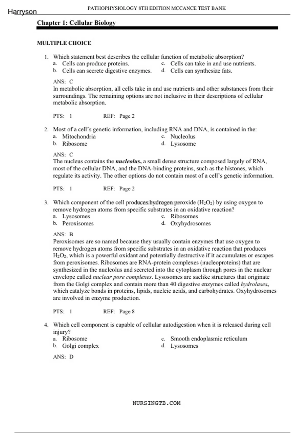 TEST BANK McCance, Huether - Pathophysiology_ The Biological Basis for DChapter 1: Cellular Biology MULTIPLE CHOICE 1. Which statement best describes the cellular function of metabolic absorption? a. Cells can produce proteins. c. Cells can take in and use nutrients. b. Cells can secrete digestive enzymes. d. Cells can synthesize fats. ANS: C In metabolic absorption, all cells take in and use nutrients and other substances from their surroundings. The remaining options are not inclusive in their descriptions of cellular metabolic absorption. PTS: 1 REF: Page 2 2. Most of a cell’s genetic information, including RNA and DNA, is contained in the: a. Mitochondria c. Nucleolus b. Ribosome d. Lysosome ANS: C The nucleus contains the nucleolus, a small dense structure composed largely of RNA, most of the cellular DNA, and the DNA-binding proteins, such as the histones, which regulate its activity. The other options do not contain most of a cell’s genetic information. PTS: 1 REF: Page 2 3. Which component of the cell produces hydrogen peroxide (H2O2) by using oxygen to remove hydrogen atoms from specific substrates in an oxidative reaction? a. Lysosomes c. Ribosomes b. Peroxisomes d. Oxyhydrosomes ANS: B Peroxisomes are so named because they usually contain enzymes that use oxygen to remove hydrogen atoms from specific substrates in an oxidative reaction that produces H2O2, which is a powerful oxidant and potentially destructive if it accumulates or escapes from peroxisomes. Ribosomes are RNA-protein complexes (nucleoproteins) that are synthesized in the nucleolus and secreted into the cytoplasm through pores in the nuclear envelope called nuclear pore complexes. Lysosomes are saclike structures that originate from the Golgi complex and contain more than 40 digestive enzymes called hydrolases, which catalyze bonds in proteins, lipids, nucleic acids, and carbohydrates. Oxyhydrosomes are involved in enzyme production. PTS: 1 REF: Page 8 4. Which cell component is capable of cellular autodigestion when it is released during cell injury? a. Ribosome c. Smooth endoplasmic reticulum b. Golgi complex d. Lysosomes ANS: D NURSIN