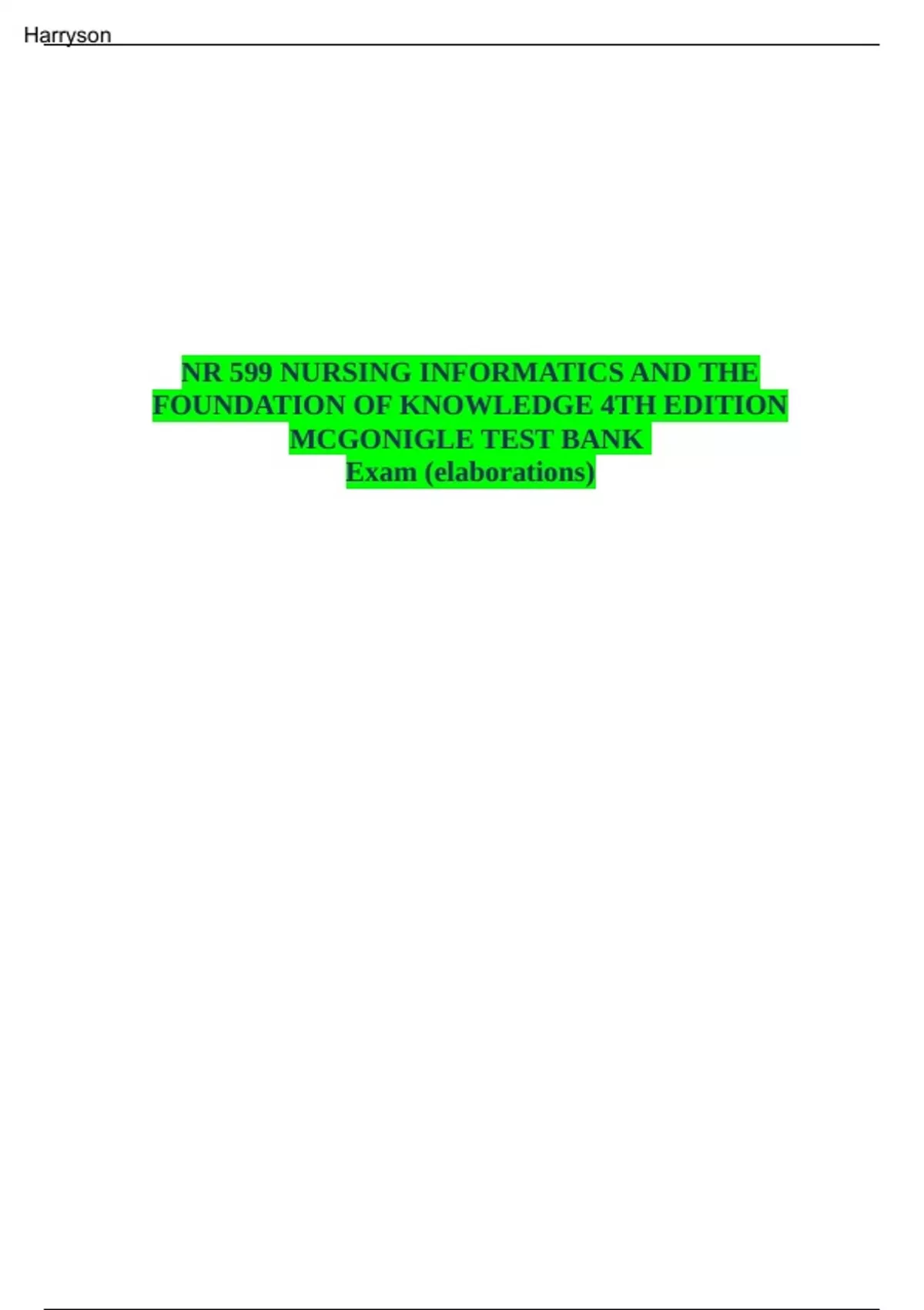 NURSING_INFORMATICS_AND_THE_FOUNDATION_OF_KNOWLEDGE_4TH_NR 599 NURSING INFORMATICS AND THE FOUNDATION OF KNOWLEDGE 4TH EDITION MCGONIGLE TEST BANK Exam (elaborations) Harryson NR599 TEST BANK (CHAPTER 1-26)/NR (LATEST 2021)QUESTION BANK NURSING INFORMATICS AND THE FOUNDATION OF KNOWLEDGE 4TH EDITION MCGONIGLE TEST BANK CHAPTER 1 NURSIND SCIENCE AND THE FOUNDATION OF KNOWLEDGE The nurse understands that nursing informatics is recognized as a specialty area of practice by which statement? 1. Research priorities for nursing informatics include the development of a standard nursing language and the development of databases for clinical information. 2. A formal educational program at the master's level must be completed before a nurse is eligible to sit for the credentialing examination. 3. As a differentiated practice, nursing informatics is focused upon the client, the environment, health, and the nurse. 4. There is a need for nursing informatics interests to gain representation by work groups and organizations within the United States. Correct Answer: 1 Rationale 1: The development of research priorities is a key point in a specialty practice. Although degrees at the master's level are available, the degree required for credentialing is typically at the bachelor's level and includes experience in the field. Current demands for safer, cost-effective, quality care require evidence of the best practices supported by research. Rationale 2: Such a formal educational program does not necessarily mean a specialty area of practice. Although degrees at the master's level are available, the degree required for credentialing is typically at the bachelor's level and includes experience in the field. The development of research priorities is a key point in a specialty practice. Rationale 3: Your chosen response refers to the entire discipline of nursing. The specialty of nursing informatics integrates nursing science, computer science, and information science to manage and communicate data, information, knowledge, and wisdom into nursing practice. The development of research priorities is a key point in a specialty practice. Rationale 4: There are many work groups in the United States related to informatics that focus on the specialty of informatics practice. One example is the Nursing Informatics Special Interest Group of the International Medical Informatics Association. The development of research priorities is a key point in a specialty practice.