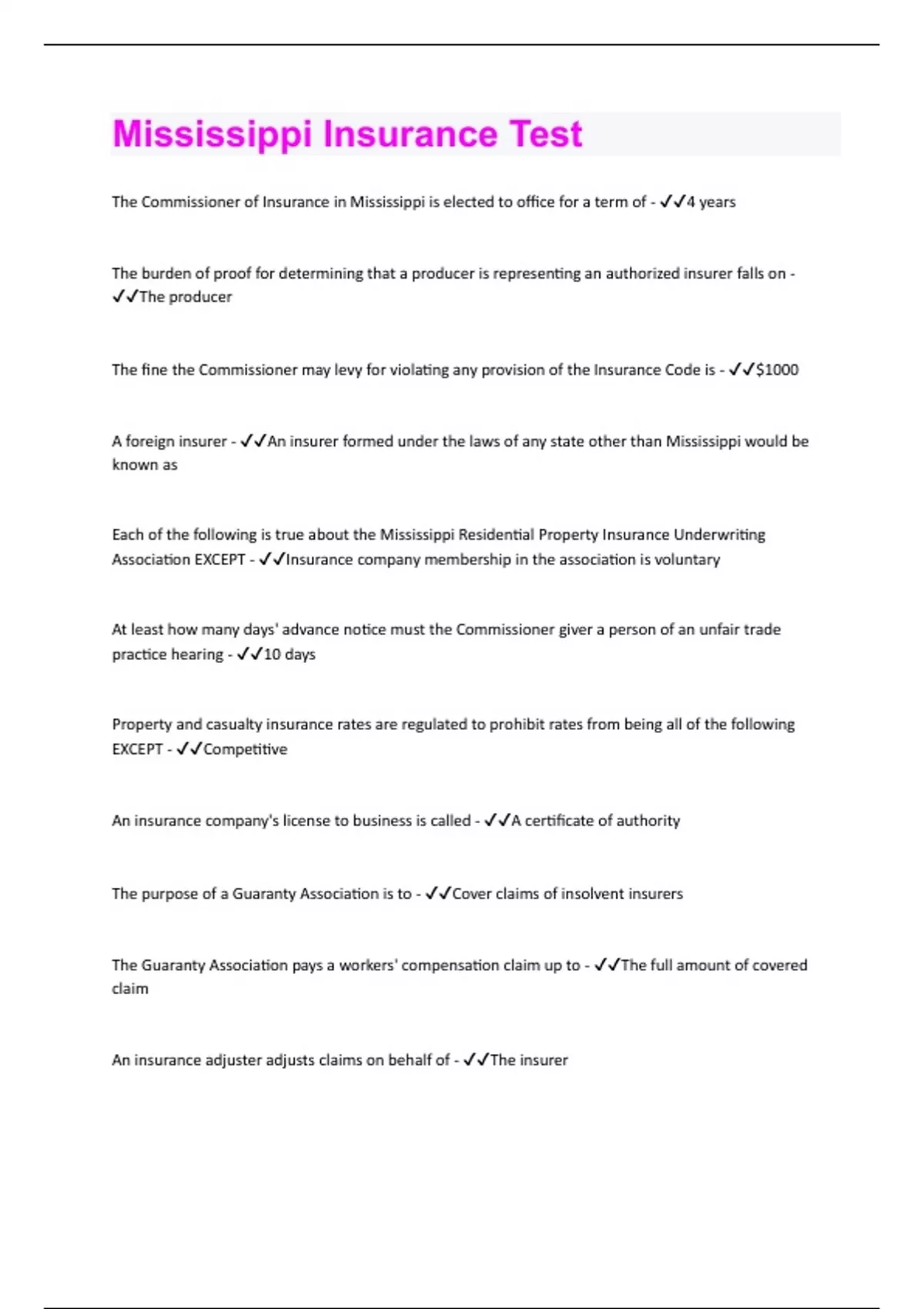 The Commissioner of Insurance in Mississippi is elected to office for a term of - 4 years The burden of proof for determining that a producer is representing an authorized insurer falls on - The producer The fine the Commissioner may levy for violating any provision of the Insurance Code is - $1000 A foreign insurer - An insurer formed under the laws of any state other than Mississippi would be known as Each of the following is true about the Mississippi Residential Property Insurance Underwriting Association EXCEPT - Insurance company membership in the association is voluntary At least how many days' advance notice must the Commissioner giver a person of an unfair trade practice hearing - 10 days Property and casualty insurance rates are regulated to prohibit rates from being all of the following EXCEPT - Competitive An insurance company's license to business is called - A certificate of authority The purpose of a Guaranty Association is to - Cover claims of insolvent insurers The Guaranty Association pays a workers' compensation claim up to - The full amount of covered claim An insurance adjuster adjusts claims on behalf of - The insurer