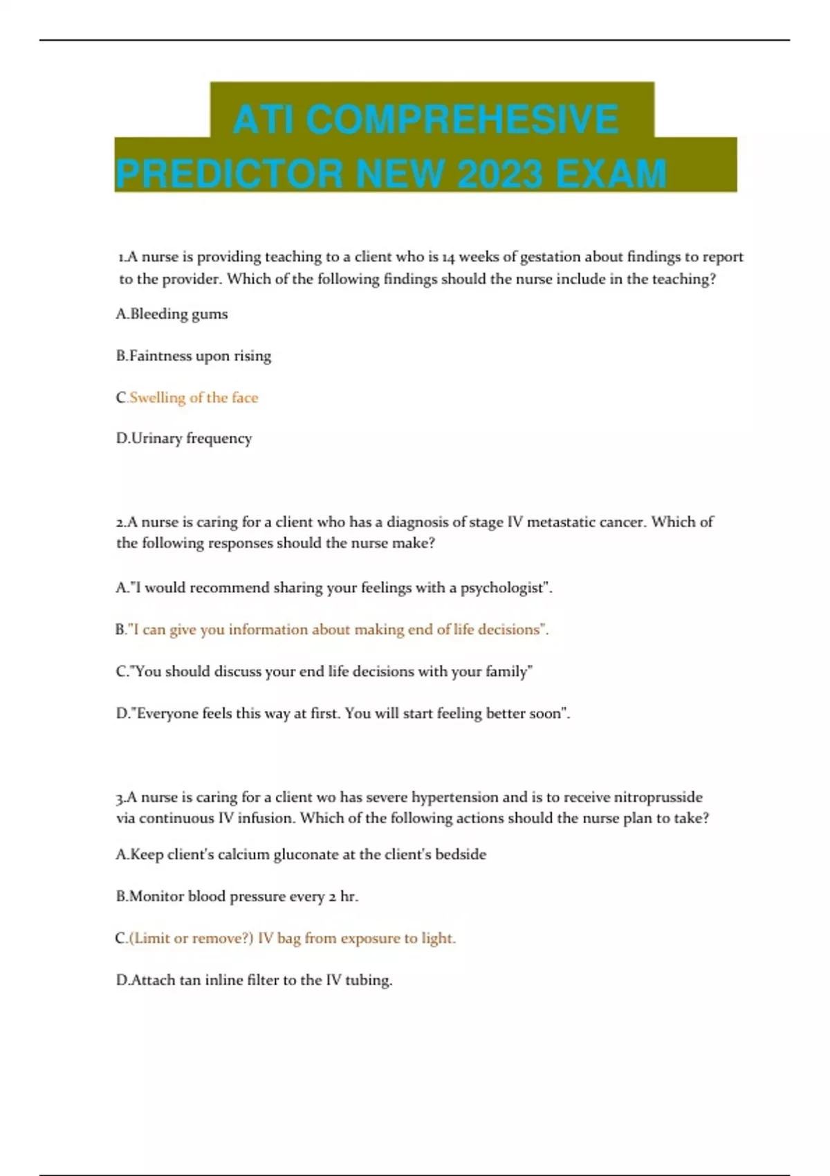 ATI COMPREHESIVE PREDICTOR NEW 2023 EXAM 1.A nurse is providing teaching to a client who is 14 weeks of gestation about findings to report to the provider. Which of the following findings should the nurse include in the teaching? A.Bleeding gums B.Faintness upon rising C.Swelling of the face D.Urinary frequency 2.A nurse is caring for a client who has a diagnosis of stage IV metastatic cancer. Which of the following responses should the nurse make? A."I would recommend sharing your feelings with a psychologist". B."I can give you information about making end of life decisions". C."You should discuss your end life decisions with your family" D."Everyone feels this way at first. You will start feeling better soon". 3.A nurse is caring for a client wo has severe hypertension and is to receive nitroprusside via continuous IV infusion. Which of the following actions should the nurse plan to take? A.Keep client's calcium gluconate at the client's bedside B.Monitor blood pressure every 2 hr. C.(Limit or remove?) IV bag from exposure to light. D.Attach tan inline filter to the IV tubing. 4.A nurse is caring for a client who is experiencing mild anxiety. Which of the following findings should the nurse expect? A.Feelings of dread B.Heightened perceptual field C.Rapid speech D.Purposeless activity 6.A nurse is reviewing the laboratory report of a client who has been having lithium carbonate for the past 12 months. The nurse notes a lithium level of 0.8 mEq/L. Which of the following orders from the provider should the nurse expect? A.Withhold the next dose. B.Increase the dosage. C.Discontinue the medication. D.Administer the medication. 7.A nurse is providing teaching to an older adult client about methods to promote nighttime sleep. Which of the following instructions should the nurse include? A.Stay in bed at least 1hr if unable to fall asleep B.Take 1 hr nap during the day C.Perform exercise prior to bed D.Eat a light snack before bedtime 8.A nurse is caring for a client who has fibromyalgia and requests pain medication. Which of the following medications should the nurse administer? A.Pregabalin B.Lorazepam C.Colchicine D.Codeine. 9.Pregabalin is used to treat epilepsy and anxiety. It's also taken to treat nerve pain. Nerve pain can be caused by different conditions including diabetes and shingles, or an injury. 10..A nurse is caring for a client following insertion of a chest tube 12 hr. ago. The (Unable to read) following actions should the nurse take? A.Assess the amount of drainage in the collection chamber. B.Clamp the chest tube during ambulation. C.Report continuous bubbling in the water seal chamber. D.Strip the chest tube every 4 hr. to maintain patency. 11.A nurse is caring for a client who is receiving morphine 4 mg via IV bolus every 4 hr. PRN. The nurse should monitor for which of the following adverse effects? A.Productive cough. B.Urinary retention. C.Rhinitis D.Fever. 12.A nurse is interviewing the partner of a client who was admitted in the manic phase of bipolar disorder. The partner states "I don't know what to do. Everything has been happening so quickly." Which of the following by the nurse is therapeutic? A."Can you talk about what happens with your partner at home?" B."Why do you think your partner's symptoms are progressing so quickly?" C."You should make sure your partner takes the prescribed medication." D."You did the right thing by bringing your partner in for treatment." 13A nurse is providing dietary teaching to a guardian of a preschooler who has a new diagnosis of celiac disease. Which of the following statements by the guardian indicates an understanding of the teaching? A."I will put my child on a gluten-free diet". B."I will administer digestive enzymes with meals and snacks". C."Provide my child with some high fiber foods." D."I will give my child whole wheat toast and milk for breakfast". 14.A nurse is caring for a client who is to receive a transfusion of packed RBCs. Which of the following actions should the nurse take? A.Prime IV tubing with 0.9% sodium chloride. B.Use a 24-gauge IV catheter C.Obtain filter less IV tubing. D.Place blood in the warmer for 1 hr. 15.A nurse is admitting a client who has diabetic ketoacidosis. Which of the following types of continuous infusions should the nurse initiate? A.0.9% normal saline. B.NPH insulin. C.Glargine insulin. D.0.45% saline. 16.A nurse is teaching who has chronic pain about avoiding constipation from opioid medications. Which of the following should the nurse include in the teaching? A.Drink 1.5L fluids each day. B.Take mineral oil at bedtime. C.Increase exercise activity D.Decrease insoluble fiber. 17.A nurse is teaching about preventative measures to a female client who has chronic urinary tract infections. Which of the following interventions should the nurse include in the teaching? A."Drink 2 liters of warm water per day". B."Empty your bladder every 6 weeks.". C."Soak in a warm bath everyday". D."Take an oral estrogen tablet". 18.A nurse is receiving change-of-shift report for a group of clients. Which of the following clients should the nurse plan to assess first? A.A client who has sinus arrhythmia and is receiving monitoring B.A client who has a hip fracture and a new onset of tachypnea C.A client who has epidural analgesia and weakness in the lower extremities D.A client who has diabetes and a hemoglobin A1C of 6.8% 19.A nurse is providing dietary teaching to a client who has a new diagnosis of irritable bowel syndrome. Which of the following recommendations should the nurse include? A.Consume food high in bran fiber B.Increase intake of milk products C.Sweeten foods with fructose corn syrup D.Increase foods high in gluten 20.A nurse is caring for a 1-day-old newborns who has jaundice and is receiving phototherapy. Which of the following actions should the nurse take? A.the infant 30 ml (1 oz) glucose water every 2 hr. B.Keep the infants head covered with a cap. C.Ensure that the newborn wears a 