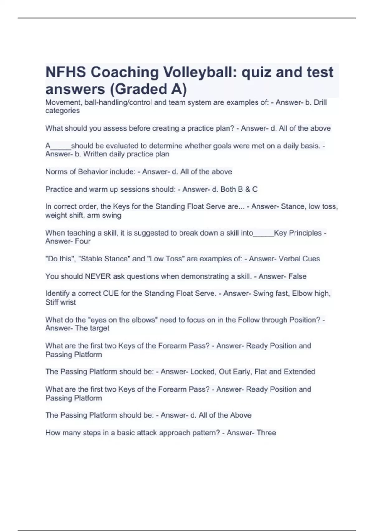 NFHS Coaching Volleyball: quiz and test answers (Graded A)
