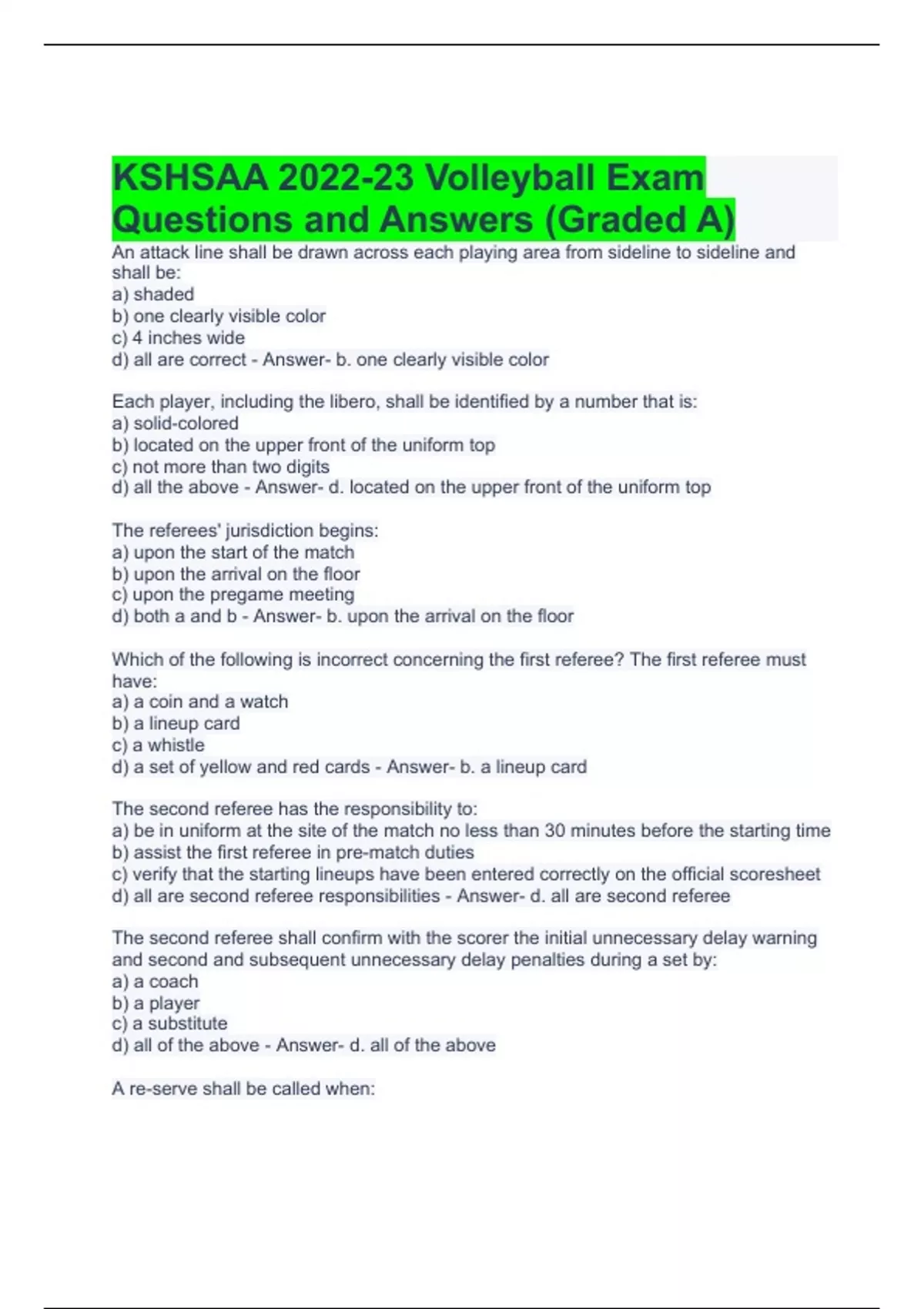 KSHSAA 2022-23 Volleyball Exam Questions and Answers (Graded A)