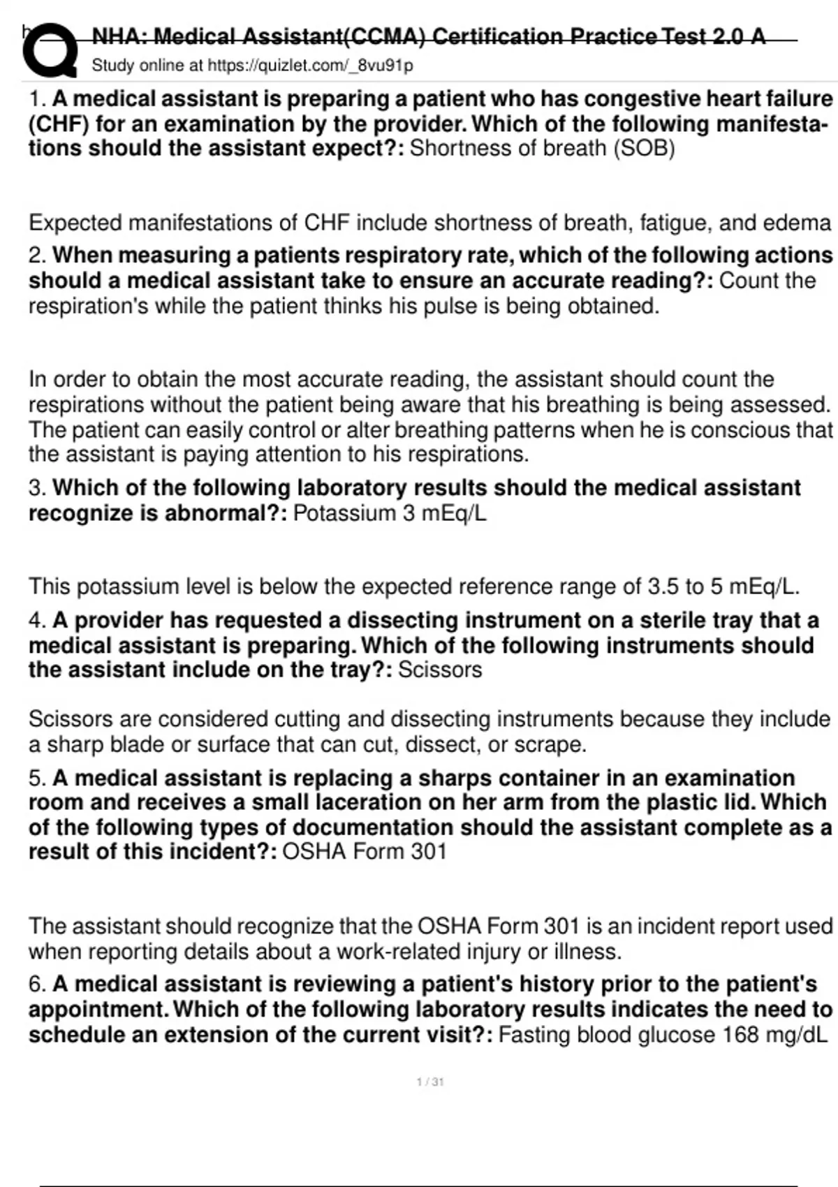 fe 5aef 4cb0 8a27 89ae6fd72599NHA: Medical Assistant(CCMA) Certification Practice Test 2.0 A Study online at 1. A medical assistant is preparing a patient who has congestive heart failure (CHF) for an examination by the provider. Which of the following manifestations should the assistant expect?: Shortness of breath (SOB) Expected manifestations of CHF include shortness of breath, fatigue, and edema 2. When measuring a patients respiratory rate, which of the following actions should a medical assistant take to ensure an accurate reading?: Count the respiration's while the patient thinks his pulse is being obtained. In order to obtain the most accurate reading, the assistant should count the respirations without the patient being aware that his breathing is being assessed. The patient can easily control or alter breathing patterns when he is conscious that the assistant is paying attention to his respirations. 3. Which of the following laboratory results should the medical assistant recognize is abnormal?: Potassium 3 mEq/L This potassium level is below the expected reference range of 3.5 to 5 mEq/L. 4. A provider has requested a dissecting instrument on a sterile tray that a medical assistant is preparing. Which of the following instruments should the assistant include on the tray?: Scissors Scissors are considered cutting and dissecting instruments because they include a sharp blade or surface that can cut, dissect, or scrape. 5. A medical assistant is replacing a sharps container in an examination room and receives a small laceration on her arm from the plastic lid. Which of the following types of documentation should the assistant complete as a result of this incident?: OSHA Form 301 The assistant should recognize that the OSHA Form 301 is an incident report used when reporting details about a work-related injury or illness. 6. A medical assistant is reviewing a patient's history prior to the patient's appointment. Which of the following laboratory results indicates the need to schedule an extension of the current visit?: Fasting blood glucose 168 mg/dL 1 / 31 h NHA: Medical Assistant(CCMA) Certification Practice Test 2.0 A Study online at This fasting blood glucose level is above the expected reference range of 70 to 130 mg/dL. The assistant should notify the provider and schedule an extension of the patient's visit. 7. A medical assistant is reinforcing instructions with a patient about how to take a buccal of the following instructions should the assistant give the patient?: "Place the tablet between you or gums and cheek." The assistant should instruct the patient to place the buccal tablet between his gums and his cheek. A buccal tablet acts faster than oral tablets because it does not need to pass through the gastrointestinal tract to be absorbed. 8. Which of the following terms should a medical assistant use to tell a provider that a patient is having discomfort and difficulty breathing?: Dyspnea Dyspnea is a term used to indicate that a patient is experiencing difficult or painful breathing. 9. Which of the following methods is used to notify a provider of the denial of a claim by an insurance carrier?: Remittance advice A remittance advice document itemizes all paid, denied, and allowable charges for a patient. This document notifies the provider of any and all claim denials. 10. Which of the following positions is appropriate for a pelvic exam?: Lithotomy The lithotomy position is appropriate for pelvic examinations. 11. Which of the following cardiac procedures is within a medical assistants scope of practice and does not require a licensed technician or provider to assist or perform it?: Holter monitor application A Holter monitor is a system for recording cardiac activity for 24 hr or longer. It is within an assistant's scope of practice to place and remove a Holter monitor