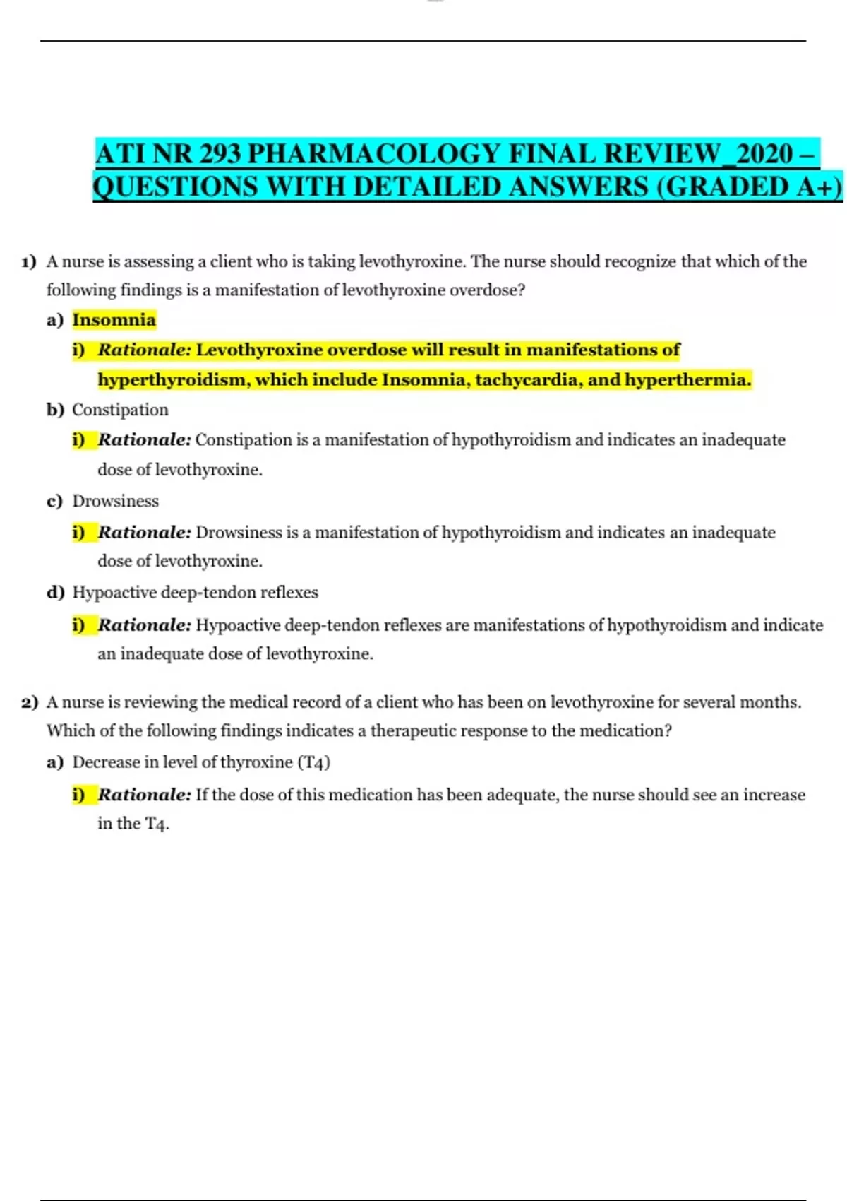 ATI NR 293 PHARMACOLOGY FINAL REVIEW_2020 – QUESTIONS WITH DETAILED ANSWERS (GRADED A+)