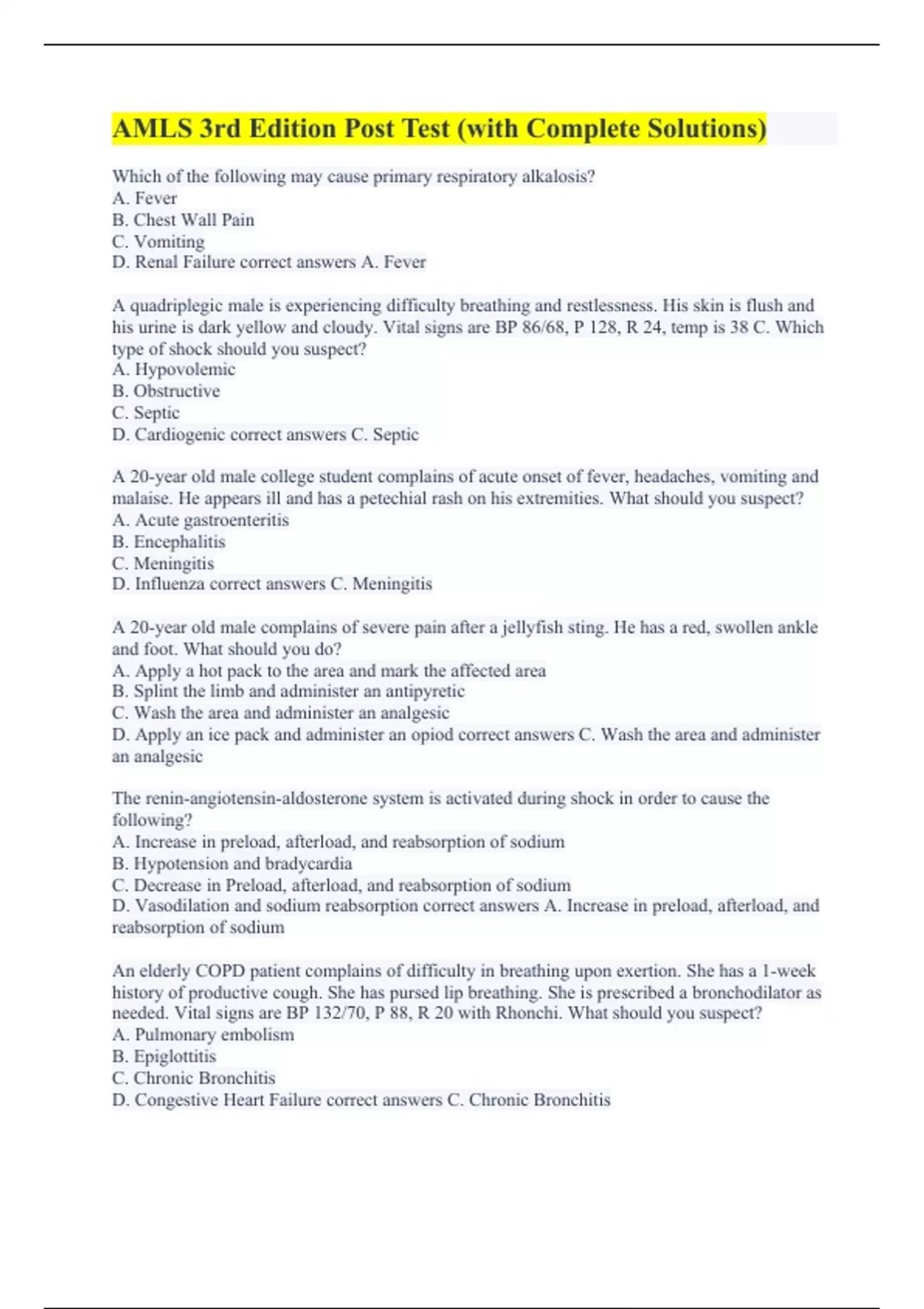 Which of the following may cause primary respiratory alkalosis? A. Fever B. Chest Wall Pain C. Vomiting D. Renal Failure correct answers A. Fever A quadriplegic male is experiencing difficulty breathing and restlessness. His skin is flush and his urine is dark yellow and cloudy. Vital signs are BP 86/68, P 128, R 24, temp is 38 C. Which type of shock should you suspect? A. Hypovolemic B. Obstructive C. Septic D. Cardiogenic correct answers C. Septic A 20-year old male college student complains of acute onset of fever, headaches, vomiting and malaise. He appears ill and has a petechial rash on his extremities. What should you suspect? A. Acute gastroenteritis B. Encephalitis C. Meningitis D. Influenza correct answers C. Meningitis A 20-year old male complains of severe pain after a jellyfish sting. He has a red, swollen ankle and foot. What should you do? A. Apply a hot pack to the area and mark the affected area B. Splint the limb and administer an antipyretic C. Wash the area and administer an analgesic D. Apply an ice pack and administer an opiod correct answers C. Wash the area and administer an analgesic The renin-angiotensin-aldosterone system is activated during shock in order to cause the following? A. Increase in preload, afterload, and reabsorption of sodium B. Hypotension and bradycardia C. Decrease in Preload, afterload, and reabsorption of sodium D. Vasodilation and sodium reabsorption correct answers A. Increase in preload, afterload, and reabsorption of sodium An elderly COPD patient complains of difficulty in breathing upon exertion. She has a 1-week history of productive cough. She has pursed lip breathing. She is prescribed a bronchodilator as needed. Vital signs are BP 132/70, P 88, R 20 with Rhonchi. What should you suspect? A. Pulmonary embolism B. Epiglottitis C. Chronic Bronchitis D. Congestive Heart Failure correct answers C. Chronic Bronchitis