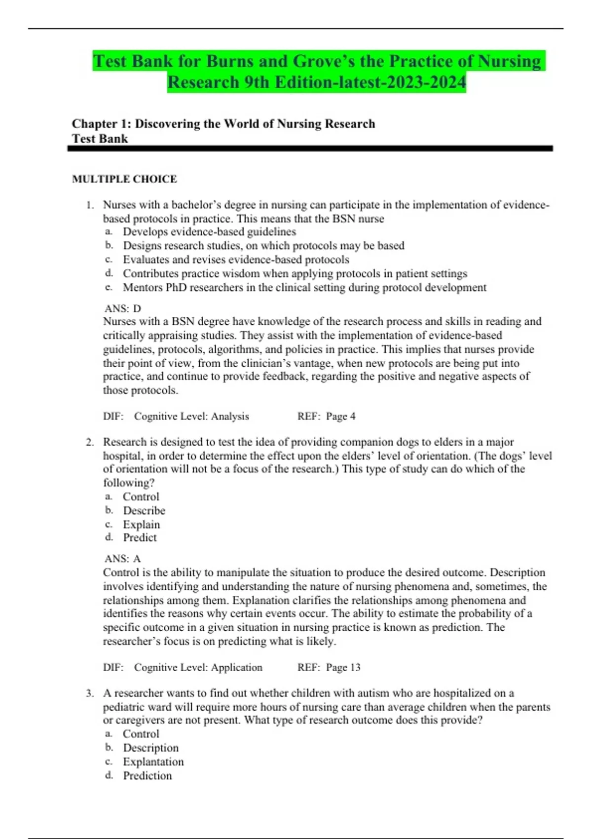 Test Bank for Burns and Grove’s the Practice of Nursing Research 9th Edition-latest- .