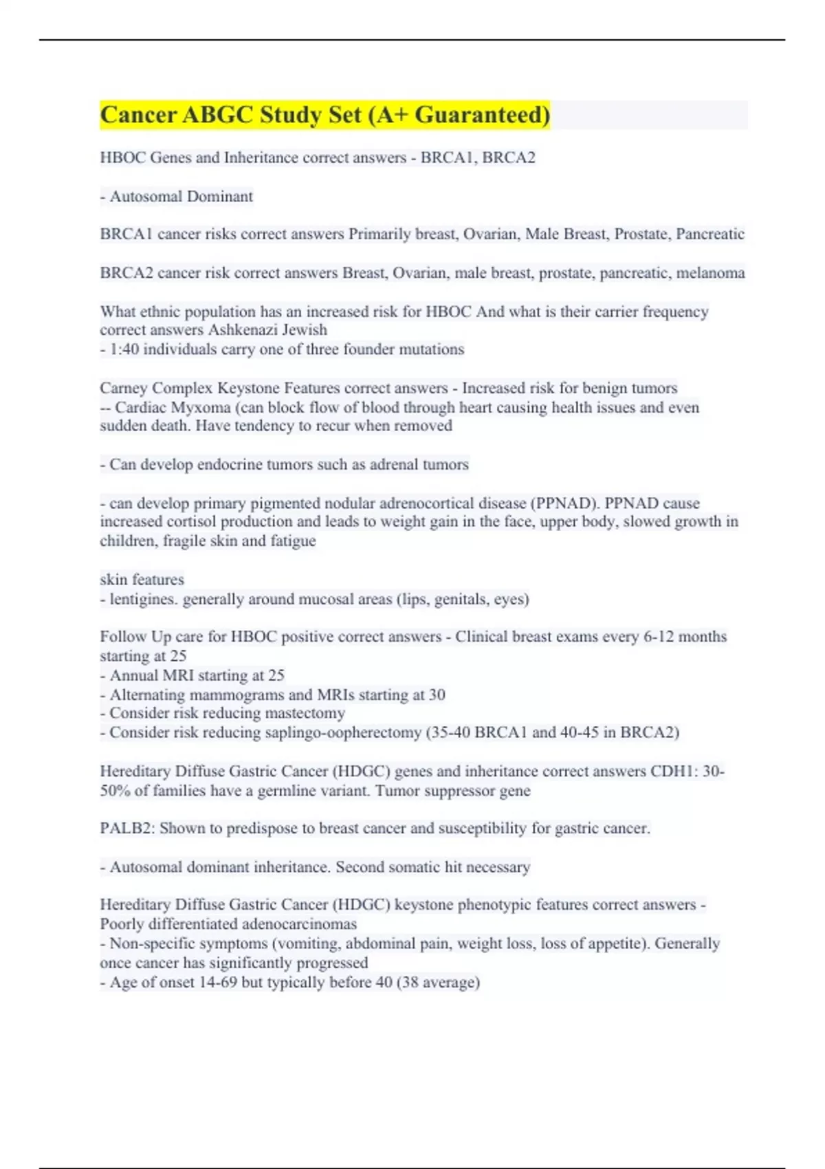 HBOC Genes and Inheritance correct answers - BRCA1, BRCA2 - Autosomal Dominant BRCA1 cancer risks correct answers Primarily breast, Ovarian, Male Breast, Prostate, Pancreatic BRCA2 cancer risk correct answers Breast, Ovarian, male breast, prostate, pancreatic, melanoma What ethnic population has an increased risk for HBOC And what is their carrier frequency correct answers Ashkenazi Jewish - 1:40 individuals carry one of three founder mutations Carney Complex Keystone Features correct answers - Increased risk for benign tumors -- Cardiac Myxoma (can block flow of blood through heart causing health issues and even sudden death. Have tendency to recur when removed - Can develop endocrine tumors such as adrenal tumors - can develop primary pigmented nodular adrenocortical disease (PPNAD). PPNAD cause increased cortisol production and leads to weight gain in the face, upper body, slowed growth in children, fragile skin and fatigue skin features - lentigines. generally around mucosal areas (lips, genitals, eyes) Follow Up care for HBOC positive correct answers - Clinical breast exams every 6-12 months starting at 25 - Annual MRI starting at 25 - Alternating mammograms and MRIs starting at 30 - Consider risk reducing mastectomy - Consider risk reducing saplingo-oopherectomy (35-40 BRCA1 and 40-45 in BRCA2) Hereditary Diffuse Gastric Cancer (HDGC) genes and inheritance correct answers CDH1: 30-50% of families have a germline variant. Tumor suppressor gene PALB2: Shown to predispose to breast cancer and susceptibility for gastric cancer. - Autosomal dominant inheritance. Second somatic hit necessary Hereditary Diffuse Gastric Cancer (HDGC) keystone phenotypic features correct answers - Poorly differentiated adenocarcinomas - Non-specific symptoms (vomiting, abdominal pain, weight loss, loss of appetite). Generally once cancer has significantly progressed - Age of onset 14-69 but typically before 40 (38 average)