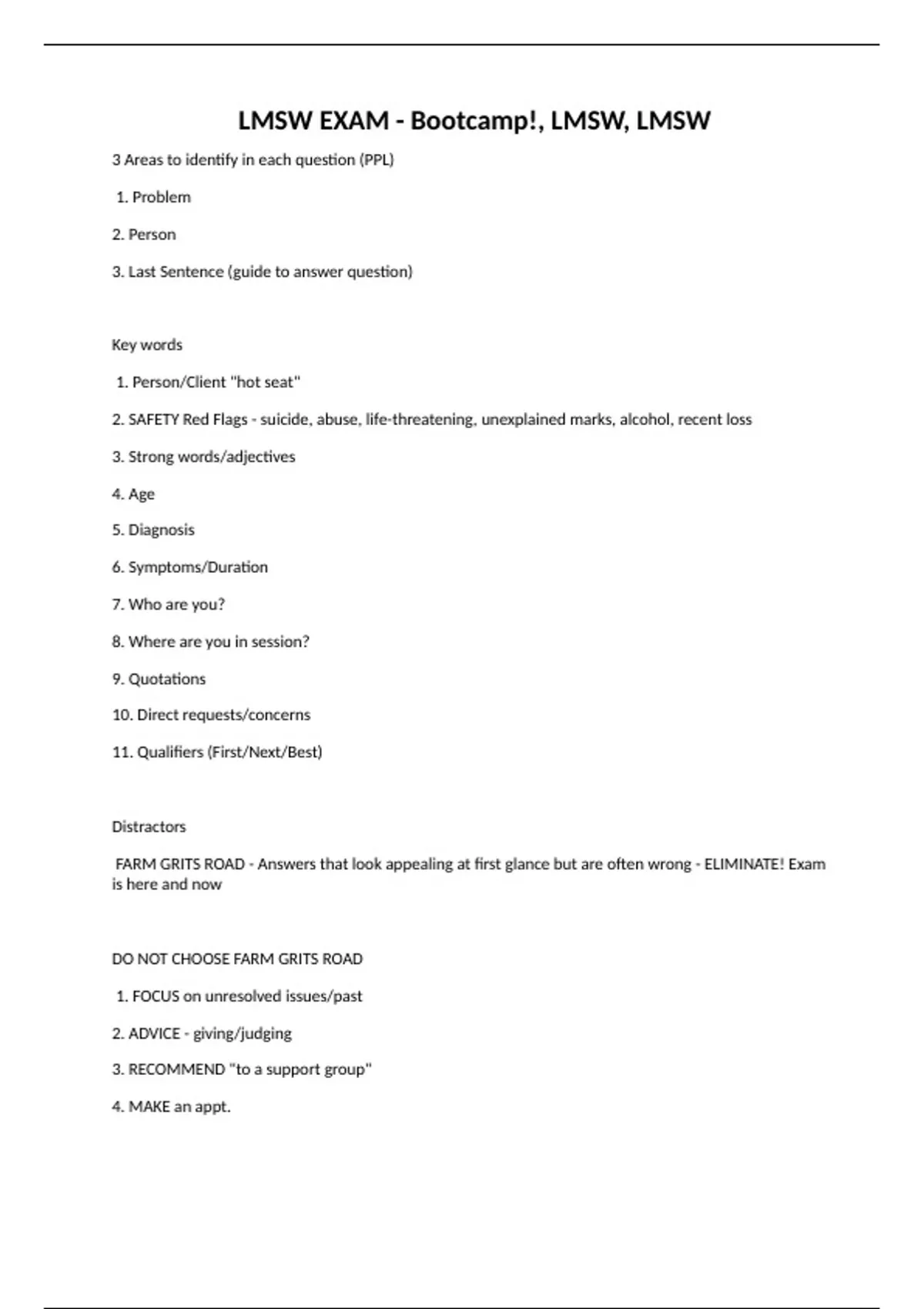 LMSW EXAM - Bootcamp!, LMSW, LMSW 3 Areas to identify in each question (PPL) 1. Problem 2. Person 3. Last Sentence (guide to answer question) 1. Person/Client "hot seat" 2. SAFETY Red Flags - suicide, abuse, life-threatening, unexplained marks, alcohol, recent loss 3. StrongKey words words/adjectives 4. Age 5. Diagnosis 6. Symptoms/Duration 7. Who are you? 8. Where are you in session? 9. Quotations 10. Direct requests/concerns 11. Qualifiers (First/Next/Best) Distractors FARM GRITS ROAD - Answers that look appealing at first glance but are often wrong - ELIMINATE! Exam is here and now DO NOT CHOOSE FARM GRITS ROAD 1. FOCUS on unresolved issues/past 2. ADVICE - giving/judging 3. RECOMMEND "to a support group" 4. MAKE an appt. 5. GIVE pamphlets/literature 6. RECOMMEND a session 7. INFORM parents/speak to parents (when child/ado) 8. TERMINATE (Exceptions: Moving, client reaches goals/no new crisis, client does not pay) 9. SPEAK to supervisor (except transference/counter) 10. RESPECT self-determination (If mentally UNSTABLE) 11. OFFER contract as a reminder 12. ALLOW the clients to lead the session 13. DO nothing/say nothing How do you answer first/next questions? 90% of exam is SAFETY FIRST. How does the exam want you to have a CLEAR understanding of client's issues? ASSESS BEFORE ACTION. RUSAFE 1. RULE out medical 2. UNDER the influence/delusional/hallucinating Do Not Treat 3. SAVE Lives - Safety first (Answers: Duty to warn, report child/elder abuse, 911, mobile crisis, ER) 4. ASSESS before action - (Answers: ASSESS, ASK or DICE - Determine, Identify,Clarify, Explore) 5. FEELINGS - (Answers: ACKNOWLEDGE person's feelings) CONCERNS (AID ASSIST, INFORM client, DISCUSS concerns) 6. EMPOWER - If client is mentally stable/alert (Answers: Respect client's decisions) COE: Ethical responsibilities towards clients 1. Client's best interests are primary 2. Respect/promote right to self-determination if client is mentally alert/stable, NOT unstable/intoxicated/psychotic 3. Informed consent, written agreement by client to undergo treatment, risks/benefits/costs disclosed 4. Avoid conflicts of interest (Things that interfere with SW's impartial judgment/discretion) 5. DO NOT promote individual therapy sessions to ppl who have a relationship w/ each other (except couples, family, group treatment) - Provide family members with appropriate referrals 6. Avoid dual/multiple relationships 7. Avoid bartering (unless common practice in community) 8. Obtain a professional translator FIRST if client does not speak the language of SW 9. Do not disclose client information w/out consent unless req'd by law 10. Provide client with reasonable access to records (First explore/discuss reason for request) Follow laws of state.