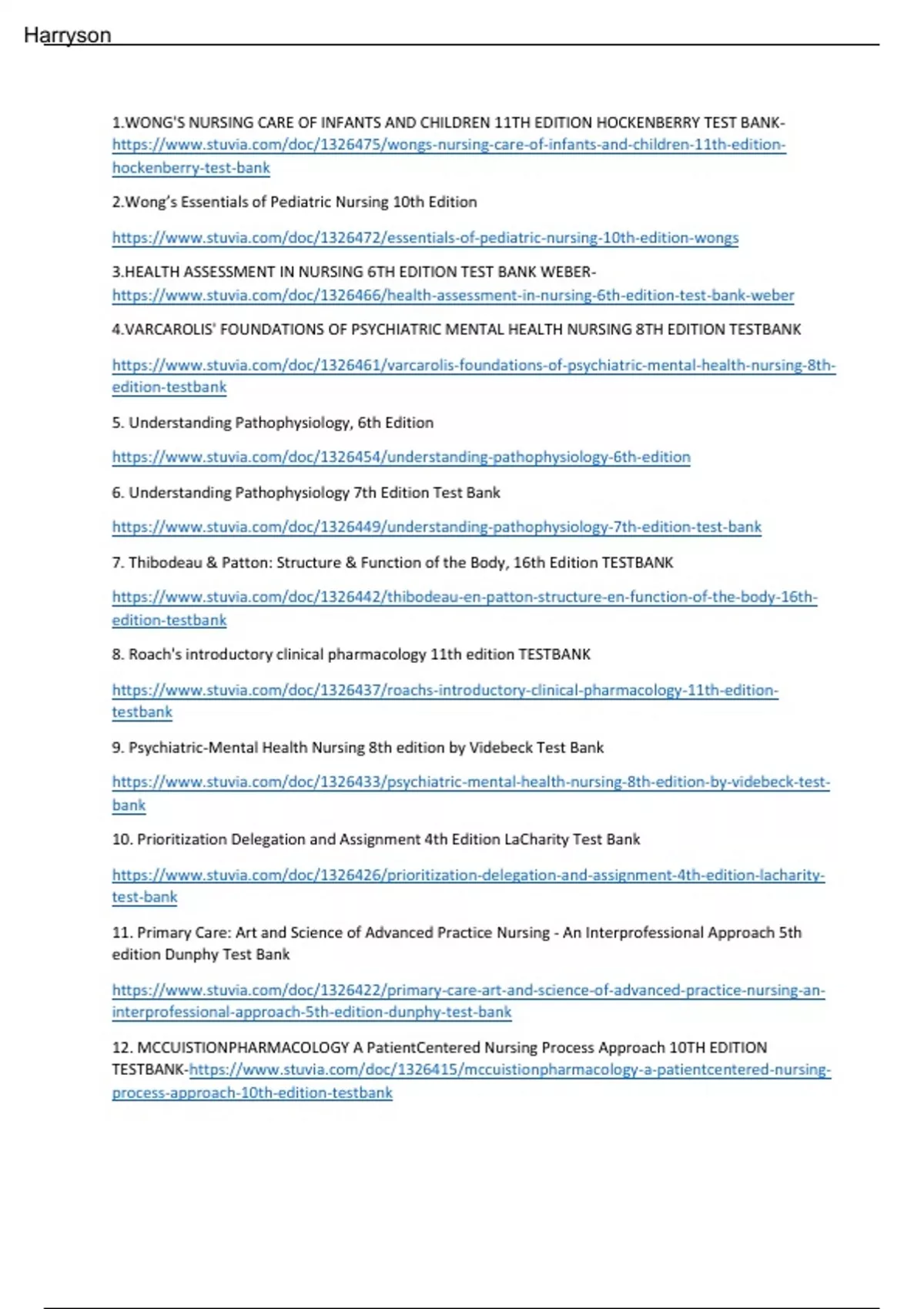 Links 1.WONG'S NURSING CARE OF INFANTS AND CHILDREN 11TH EDITION HOCKENBERRY TEST BANK 2.Wong’s Essentials of Pediatric Nursing 10th Edition 3.HEALTH ASSESSMENT IN NURSING 6TH EDITION TEST BANK WEBER 4.VARCAROLIS' FOUNDATIONS OF PSYCHIATRIC MENTAL HEALTH NURSING 8TH EDITION TESTBANK 5. Understanding Pathophysiology, 6th Edition 6. Understanding Pathophysiology 7th Edition Test Bank 7. Thibodeau & Patton: Structure & Function of the Body, 16th Edition TESTBANK 8. Roach's introductory clinical pharmacology 11th edition TESTBANK 9. Psychiatric-Mental Health Nursing 8th edition by Videbeck Test Bank 10. Prioritization Delegation and Assignment 4th Edition LaCharity Test Bank 11. Primary Care: Art and Science of Advanced Practice Nursing - An Interprofessional Approach 5th edition Dunphy Test Bank 12. MCCUISTIONPHARMACOLOGY A PatientCentered Nursing Process Approach 10TH EDITION TESTBANK-