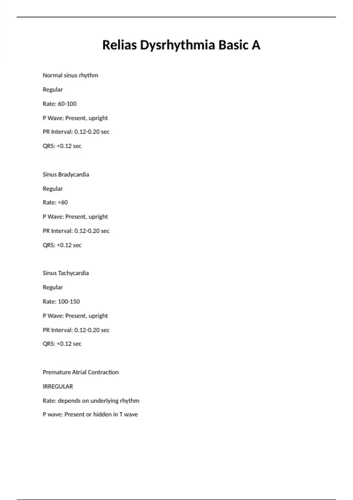 Relias Dysrhythmia Basic A Normal sinus rhythm Regular Rate: 60-100 P Wave: Present, upright PR Interval: 0.12-0.20 sec QRS: 0.12 sec Sinus Bradycardia Regular Rate: 60 P Wave: Present, upright PR Interval: 0.12-0.20 sec QRS: 0.12 sec Sinus Tachycardia Regular Rate: 100-150 P Wave: Present, upright PR Interval: 0.12-0.20 sec QRS: 0.12 sec Premature Atrial Contraction IRREGULAR Rate: depends on underlying rhythm P wave: Present or hidden in T wave PR Interval: 0.12-0.20 sec QRS: 0.12 sec Atrial Fibrillation IRREGULAR Atrial rate: UNMEASURABLE Ventricular rate: variable P wave: unable to see PR Interval: N/A QRS: 0.12 sec A fib RVR IRREGULAR Ventricular rate: 100-175 P wave: unable to see PR Interval: N/A QRS 0.12 sec Atrial Flutter Usually REGULAR can be irregular Atrial rate: 250-350 Ventricular rate: variable BUT atrial rate P Wave: Flutter PR Interval: N/A QRS: 0.12 sec Supraventricular Tachycardia Regular Rate: 150-350 P wave: Hidden in QRS or T wave PR: unable to determine QRS: 0.12 sec Junctional Rhythm Regular Rate: 40-60 P Wave: ABSENT or INVERTED PR Interval: None or 0.12 QRS: 0.12 sec Accelerated Junctional Rhythm Regular Rate: 60-100 P Wave: NONE or INVERTED PR Interval: None or 0.12 QRS: 0.12 sec Junctional Tachycardia Regular Rate: 100 P Wave: NONE or INVERTED PR Interval: None or 0.12 QRS: 0.12 sec Premature Ventricular Contraction IRREGULAR Rate: refer to underlying rhythm P Wave: NONE PR Interval: N/A QRS: WIDE and BIZARRE , 0.12 sec Ventricular Tachycardia Regular Rate: 100 P Wave: NONE PR Interval: N/A QRS: WIDE and BIZARRE, 0.12 sec Ventricular Fibrillation Chaotic Coarse: big waves Fine: small waves Rate: unmeasurable P Wave: NONE PR Interval: N/A QRS: N/A Idioventricular Regular Rate: 20-50 P wave: NONE PR Interval: N/A QRS: WIDE, 0.12 sec Accelerated Idoventricular Rhythm Regular Rate: 50-100 P wave: NONE PR Interval: N/A QRS: WIDE, 0.12 sec 1st Degree AV Block Regular Rate: 60-100 P Wave: Present, upright PR interval: 0.20 sec CONSISTENTLY LONG QRS: 0.12 sec Husband stays late till 9 consistently 2nd Degree AV Block Type I Mobitz, Wenckebach IRREGULAR Rate: 60-100 P wave: Present, upright PR Interval: Progressively longer until drop (PR interval longer and longer until drop) QRS: 0.12 sec Husband stays late till 9, then 11, then 1, then doesn't come home at all 2nd Degree AV Block Type II Irregular or regular Rate: 60 P wave: Present, upright PR Interval: PR interval consistently LONGER like type 1 but then a QRS will drop QRS: 0.12 sec Husband stays late till 9 consistently, then wife goes out and doesn't come home 3rd Degree AV Block Atrials and ventricles don't communicate Rate: regular atrial P wave: Present, upright No relationship between P waves and QRS PR Interval: VARIABLE QRS: variable P-P ad R-R consistent but NO correlation Husband and wife live separate lives and don't communicate SA Node 1st 60-100 AV Node 2nd 40-60 Bundle of His 3rd