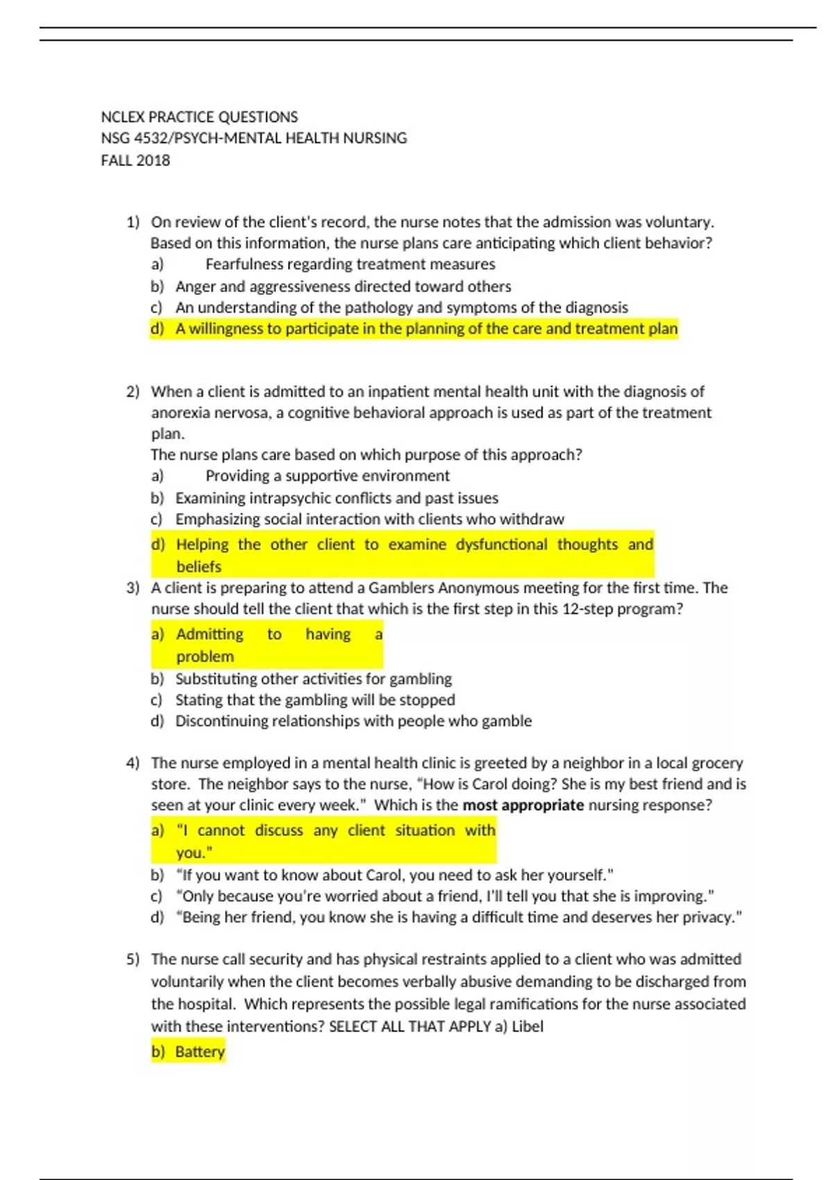 NCLEX PRACTICE QUESTIONS NSG 4532/PSYCH-MENTAL HEALTH NURSING FALL 2018