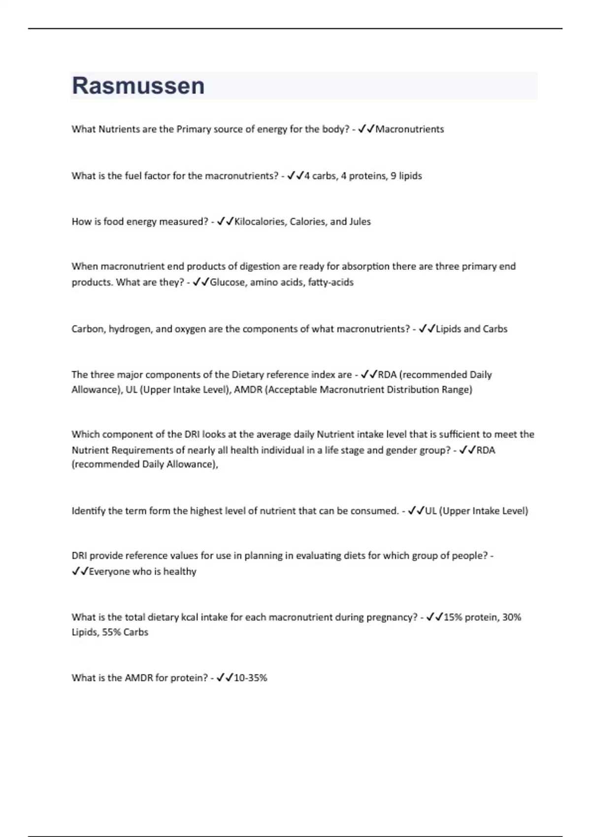 What Nutrients are the Primary source of energy for the body? - Macronutrients What is the fuel factor for the macronutrients? - 4 carbs, 4 proteins, 9 lipids How is food energy measured? - Kilocalories, Calories, and Jules When macronutrient end products of digestion are ready for absorption there are three primary end products. What are they? - Glucose, amino acids, fatty-acids Carbon, hydrogen, and oxygen are the components of what macronutrients? - Lipids and Carbs The three major components of the Dietary reference index are - RDA (recommended Daily Allowance), UL (Upper Intake Level), AMDR (Acceptable Macronutrient Distribution Range) Which component of the DRI looks at the average daily Nutrient intake level that is sufficient to meet the Nutrient Requirements of nearly all health individual in a life stage and gender group? - RDA (recommended Daily Allowance), Identify the term form the highest level of nutrient that can be consumed. - UL (Upper Intake Level) DRI provide reference values for use in planning in evaluating diets for which group of people? - Everyone who is healthy What is the total dietary kcal intake for each macronutrient during pregnancy? - 15% protein, 30% Lipids, 55% Carbs What is the AMDR for protein? - 10-35%