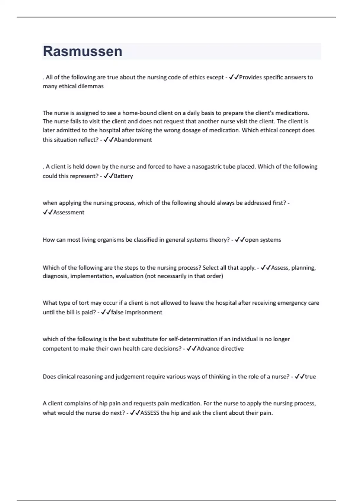 . All of the following are true about the nursing code of ethics except - Provides specific answers to many ethical dilemmas The nurse is assigned to see a home-bound client on a daily basis to prepare the client's medications. The nurse fails to visit the client and does not request that another nurse visit the client. The client is later admitted to the hospital after taking the wrong dosage of medication. Which ethical concept does this situation reflect? - Abandonment . A client is held down by the nurse and forced to have a nasogastric tube placed. Which of the following could this represent? - Battery when applying the nursing process, which of the following should always be addressed first? - Assessment How can most living organisms be classified in general systems theory? - open systems Which of the following are the steps to the nursing process? Select all that apply. - Assess, planning, diagnosis, implementation, evaluation (not necessarily in that order) What type of tort may occur if a client is not allowed to leave the hospital after receiving emergency care until the bill is paid? - false imprisonment which of the following is the best substitute for self-determination if an individual is no longer competent to make their own health care decisions? - Advance directive Does clinical reasoning and judgement require various ways of thinking in the role of a nurse? - true A client complains of hip pain and requests pain medication. For the nurse to apply the nursing process, what would the nurse do next? - ASSESS the hip and ask the client about their pain.