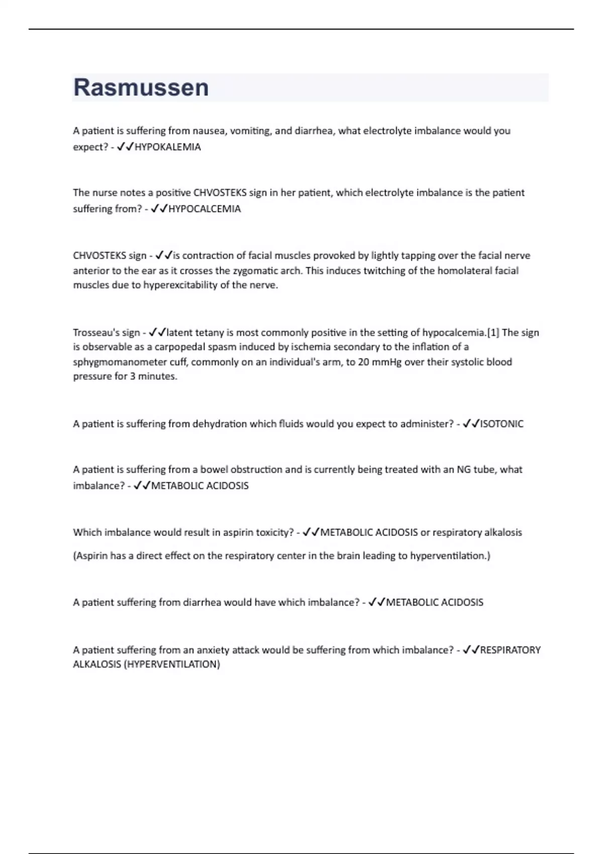 A patient is suffering from nausea, vomiting, and diarrhea, what electrolyte imbalance would you expect? - HYPOKALEMIA The nurse notes a positive CHVOSTEKS sign in her patient, which electrolyte imbalance is the patient suffering from? - HYPOCALCEMIA CHVOSTEKS sign - is contraction of facial muscles provoked by lightly tapping over the facial nerve anterior to the ear as it crosses the zygomatic arch. This induces twitching of the homolateral facial muscles due to hyperexcitability of the nerve. Trosseau's sign - latent tetany is most commonly positive in the setting of hypocalcemia.[1] The sign is observable as a carpopedal spasm induced by ischemia secondary to the inflation of a sphygmomanometer cuff, commonly on an individual's arm, to 20 mmHg over their systolic blood pressure for 3 minutes. A patient is suffering from dehydration which fluids would you expect to administer? - ISOTONIC A patient is suffering from a bowel obstruction and is currently being treated with an NG tube, what imbalance? - METABOLIC ACIDOSIS Which imbalance would result in aspirin toxicity? - METABOLIC ACIDOSIS or respiratory alkalosis (Aspirin has a direct effect on the respiratory center in the brain leading to hyperventilation.) A patient suffering from diarrhea would have which imbalance? - METABOLIC ACIDOSIS A patient suffering from an anxiety attack would be suffering from which imbalance? - RESPIRATORY ALKALOSIS (HYPERVENTILATION)