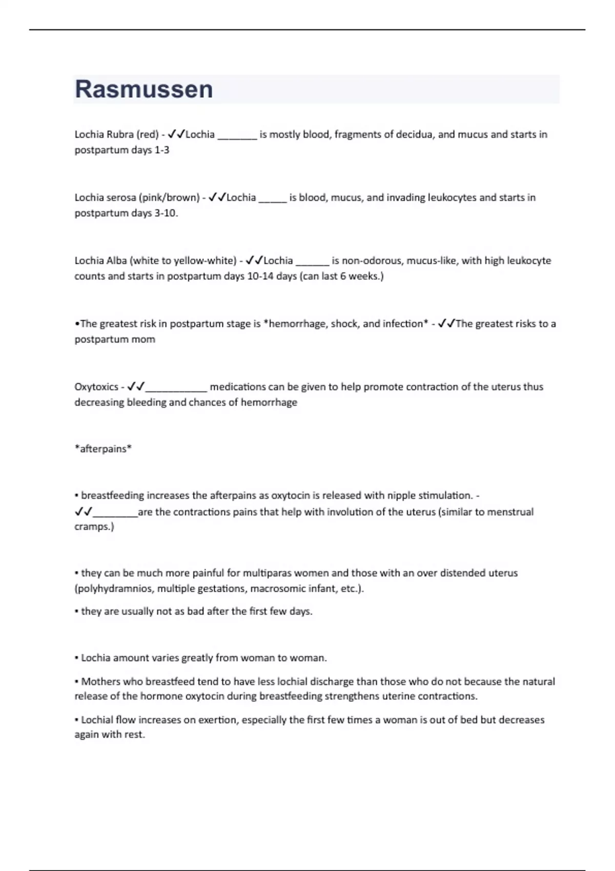 Lochia Rubra (red) - Lochia _______ is mostly blood, fragments of decidua, and mucus and starts in postpartum days 1-3 Lochia serosa (pink/brown) - Lochia _____ is blood, mucus, and invading leukocytes and starts in postpartum days 3-10. Lochia Alba (white to yellow-white) - Lochia ______ is non-odorous, mucus-like, with high leukocyte counts and starts in postpartum days 10-14 days (can last 6 weeks.) •The greatest risk in postpartum stage is *hemorrhage, shock, and infection* - The greatest risks to a postpartum mom Oxytoxics - ___________ medications can be given to help promote contraction of the uterus thus decreasing bleeding and chances of hemorrhage *afterpains* ▪ breastfeeding increases the afterpains as oxytocin is released with nipple stimulation. - ________are the contractions pains that help with involution of the uterus (similar to menstrual cramps.) ▪ they can be much more painful for multiparas women and those with an over distended uterus (polyhydramnios, multiple gestations, macrosomic infant, etc.). ▪ they are usually not as bad after the first few days. ▪ Lochia amount varies greatly from woman to woman. ▪ Mothers who breastfeed tend to have less lochial discharge than those who do not because the natural release of the hormone oxytocin during breastfeeding strengthens uterine contractions. ▪ Lochial flow increases on exertion, especially the first few times a woman is out of bed but decreases again with rest.