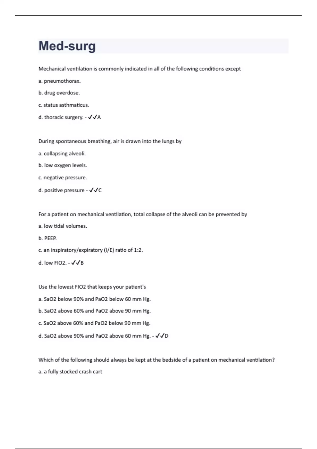 Mechanical ventilation is commonly indicated in all of the following conditions except a. pneumothorax. b. drug overdose. c. status asthmaticus. d. thoracic surgery. - A During spontaneous breathing, air is drawn into the lungs by a. collapsing alveoli. b. low oxygen levels. c. negative pressure. d. positive pressure - C For a patient on mechanical ventilation, total collapse of the alveoli can be prevented by a. low tidal volumes. b. PEEP. c. an inspiratory/expiratory (I/E) ratio of 1:2. d. low FIO2. - B Use the lowest FIO2 that keeps your patient's a. SaO2 below 90% and PaO2 below 60 mm Hg. b. SaO2 above 60% and PaO2 above 90 mm Hg. c. SaO2 above 60% and PaO2 below 90 mm Hg. d. SaO2 above 90% and PaO2 above 60 mm Hg. - D Which of the following should always be kept at the bedside of a patient on mechanical ventilation? a. a fully stocked crash cart